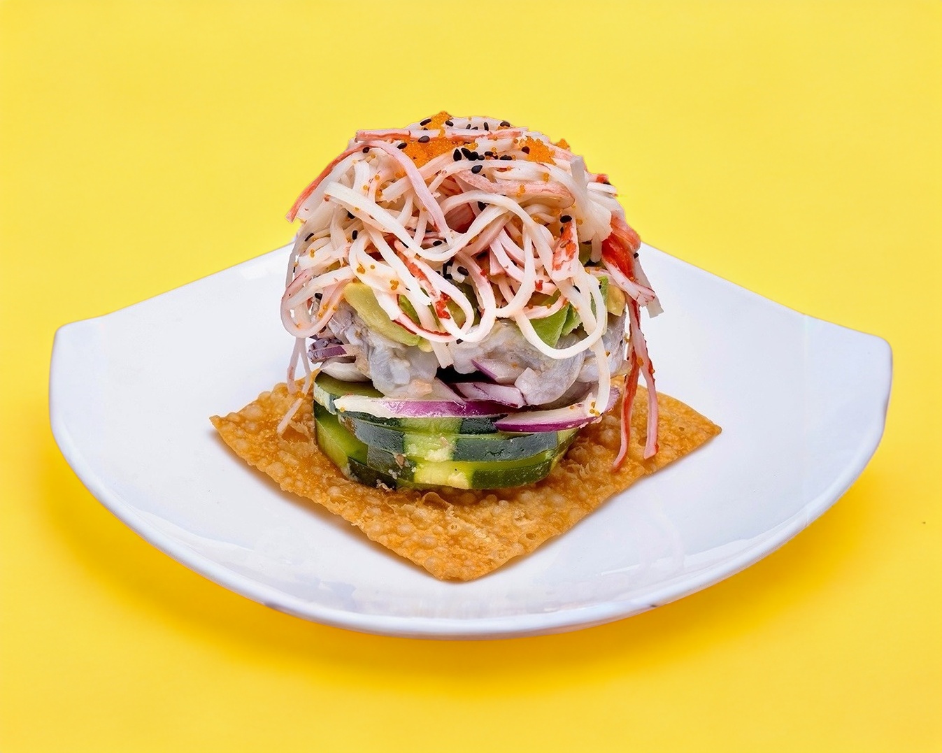 Deliciosa tostada de camarón aguachile, kanikama, aguacate, cebolla morada y pepino.