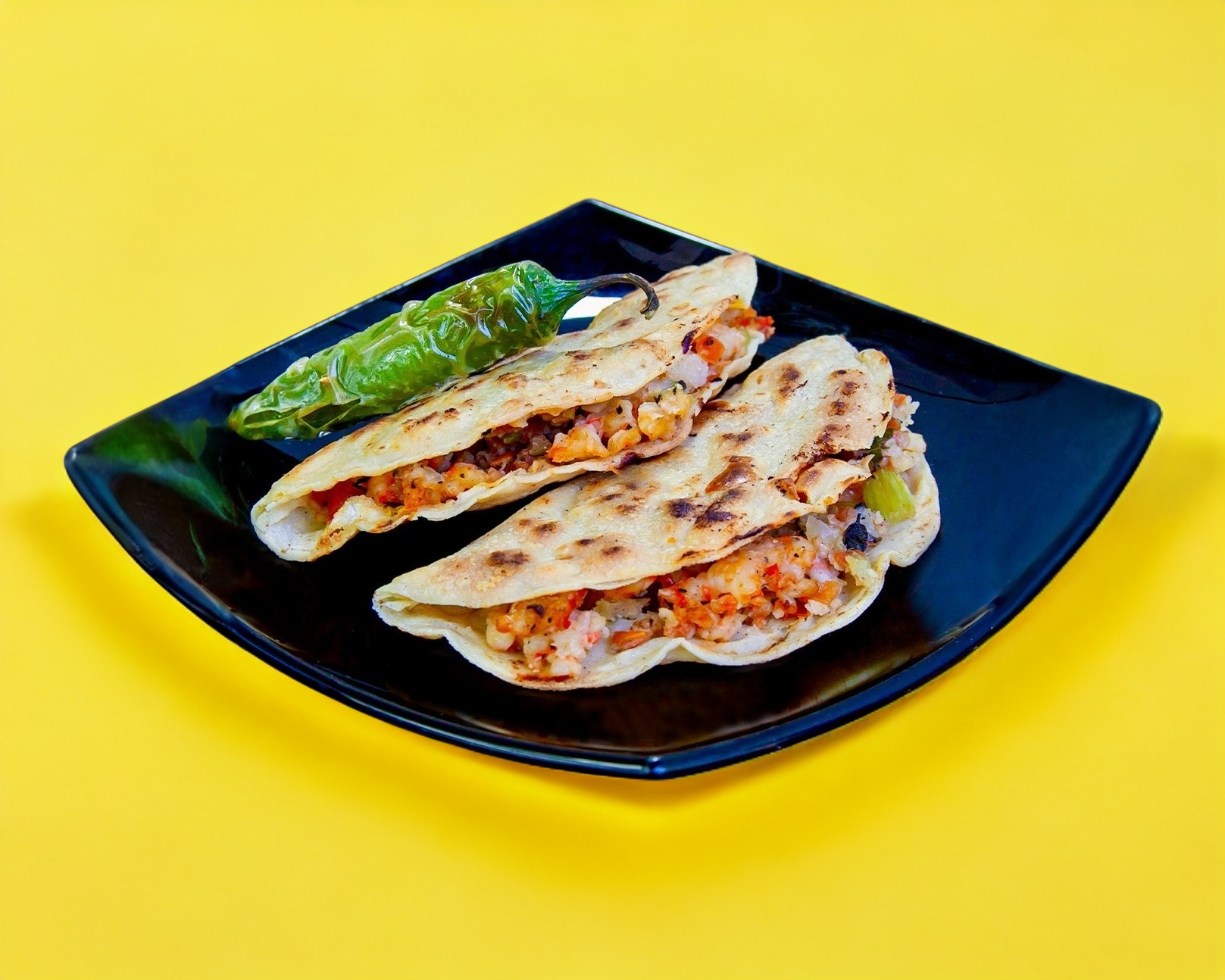 Taco de camarón guisado con tomate, cebolla, apio, chile verde y queso chihuahua, coronado con chile jalapeño asado.
