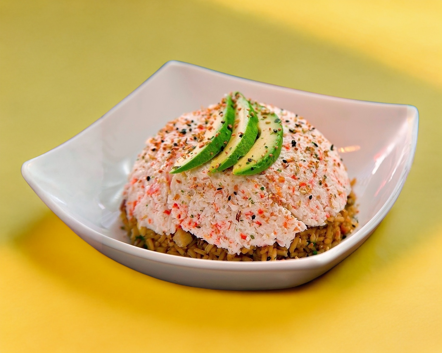 Arroz frito con res, pollo y tocino, con zanahoria, calabaza, cebollín, apio y un rico topping de philadelphia, tampico, aguacate y furikake.
