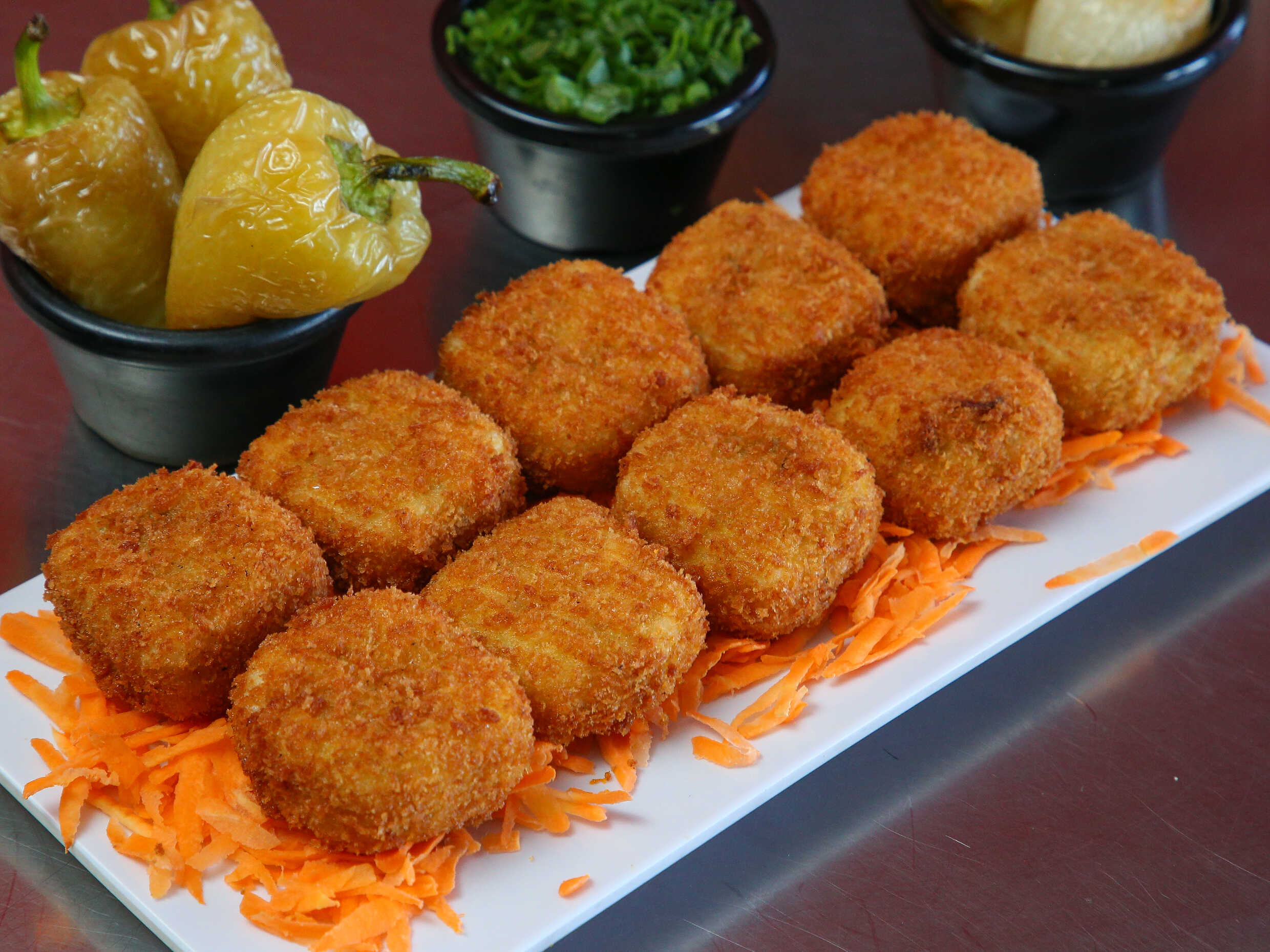3 chiles caribes rellenos de Tampico, chihuahua, philadelphia, res y camarón, empanizados y gratinados.