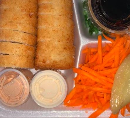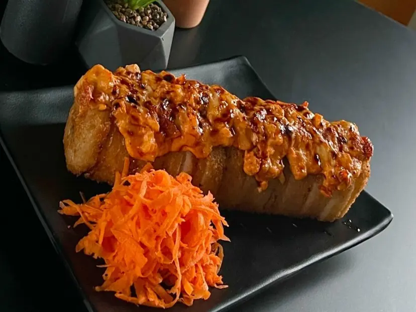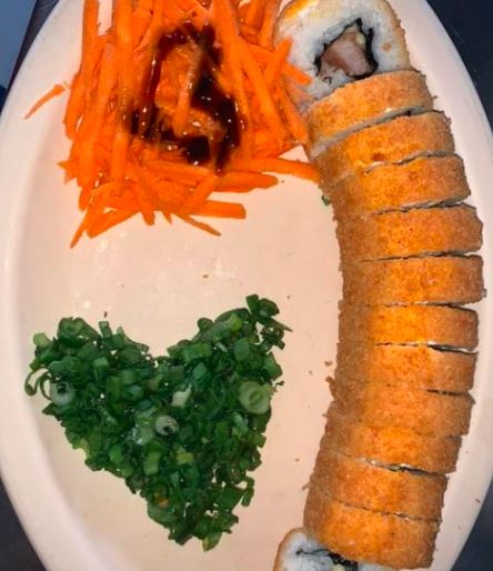 Philadelphia, alga, aguacate, res, camarón por dentro gratinado por fuera acompañado de un tampoco.