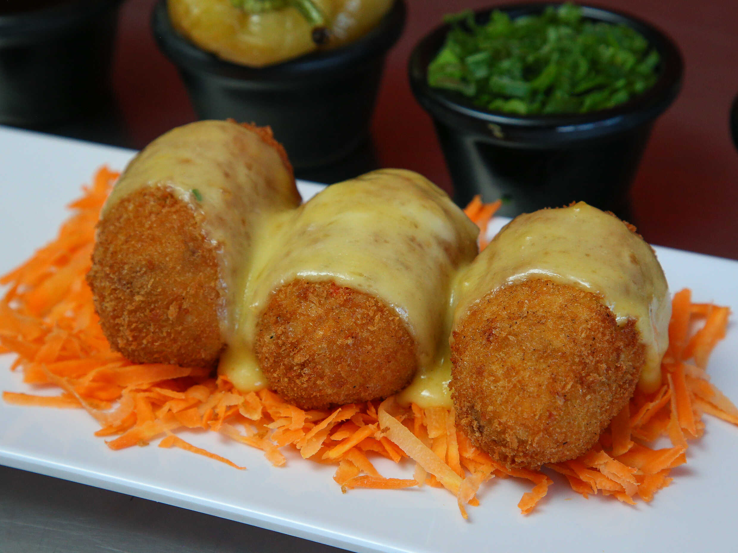 Philadelphia, alga, aguacate, camarón, pollo y tocino por dentro, empanizado pieza por pieza.