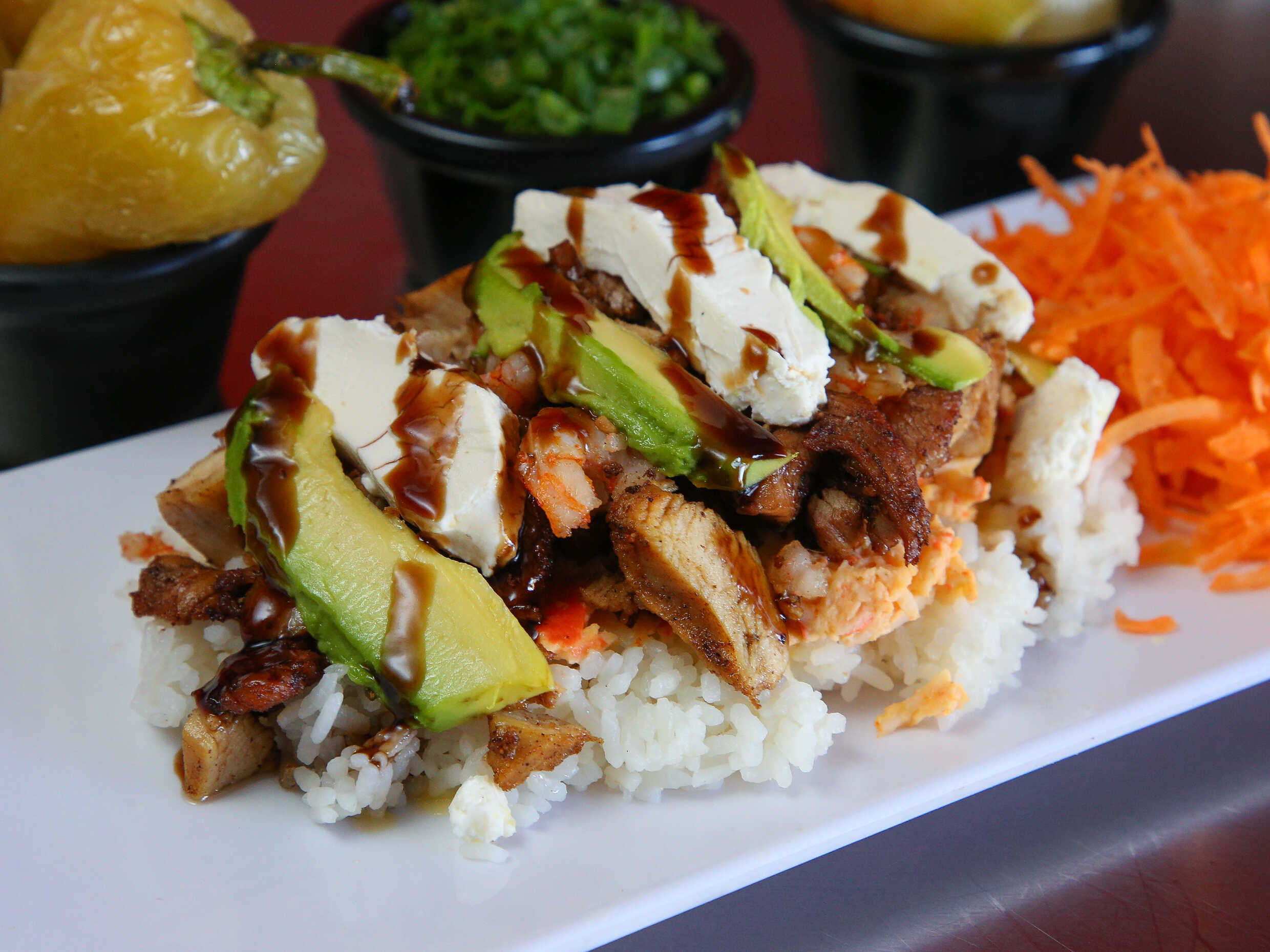 Arroz blanco al vapor con Tampico aguacate, philadelphia res, pollo y camarón por arriba.