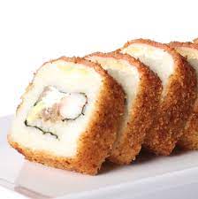 Philadelphia, alga, aguacate, camarón y surimi empanizado por dentro philadelphia y aguacate por fuera.