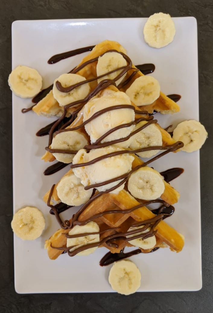 (Manzana roja, plátano, granola, nuez y leche de su elección*).