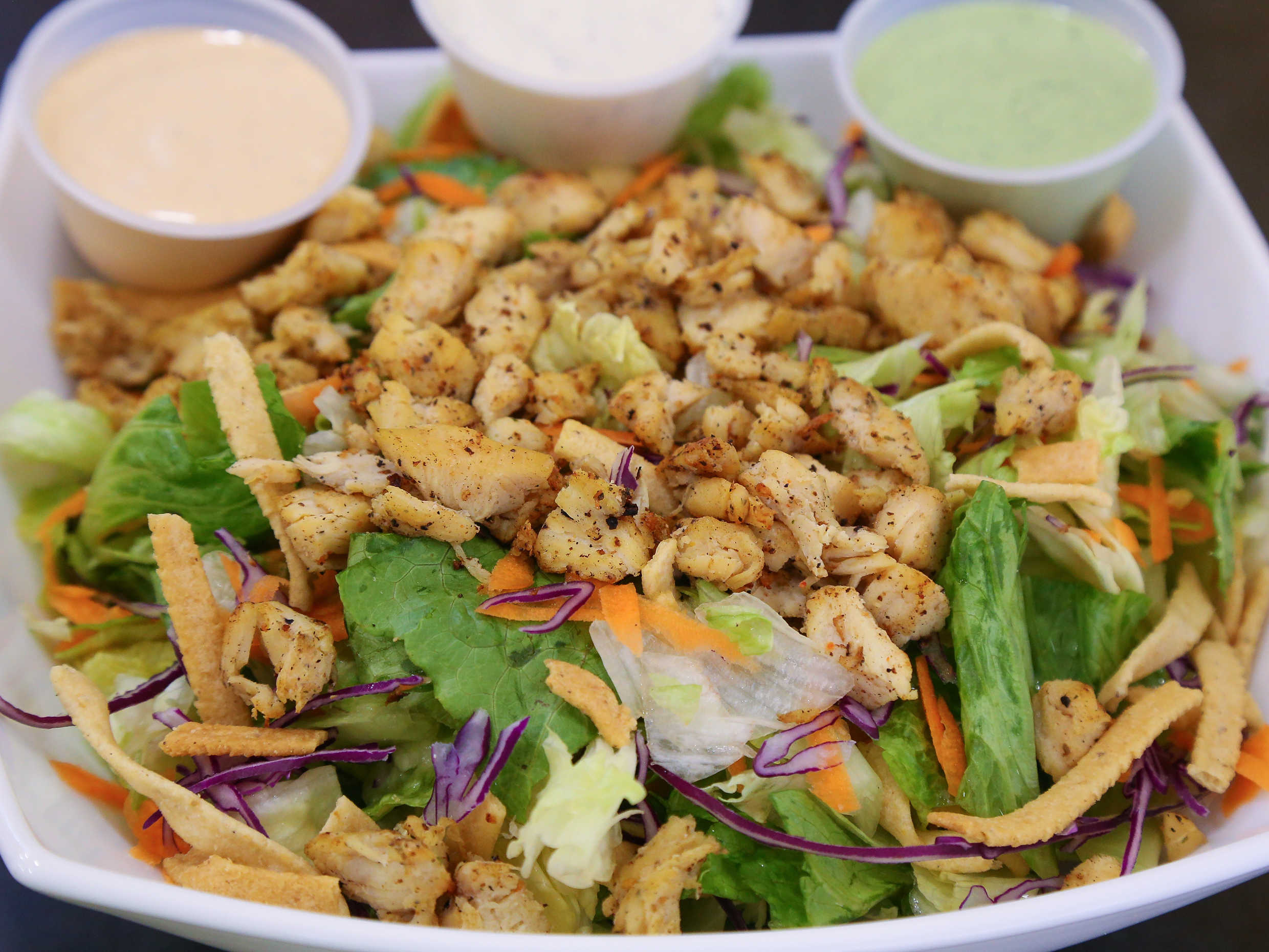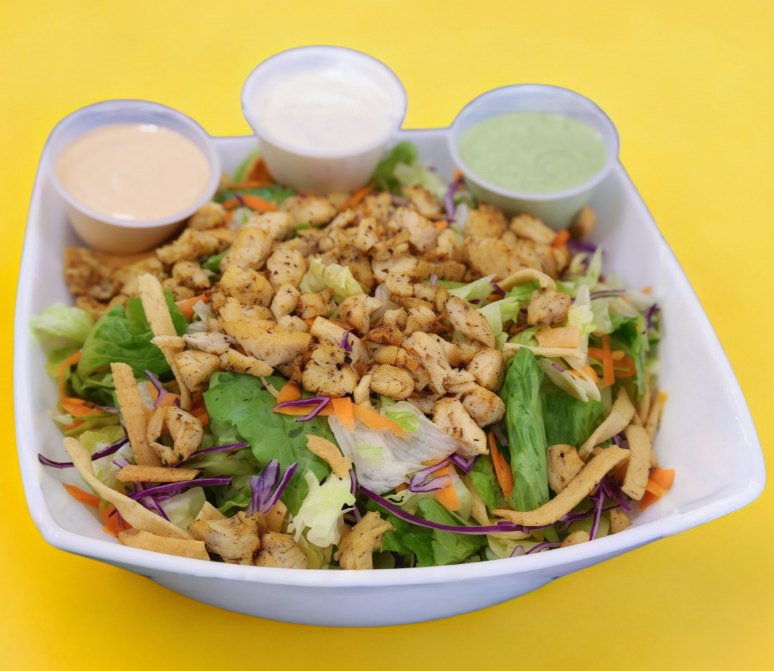 (Pollo, lechuga, zanahoria, col, frituras y aderezo a elegir).