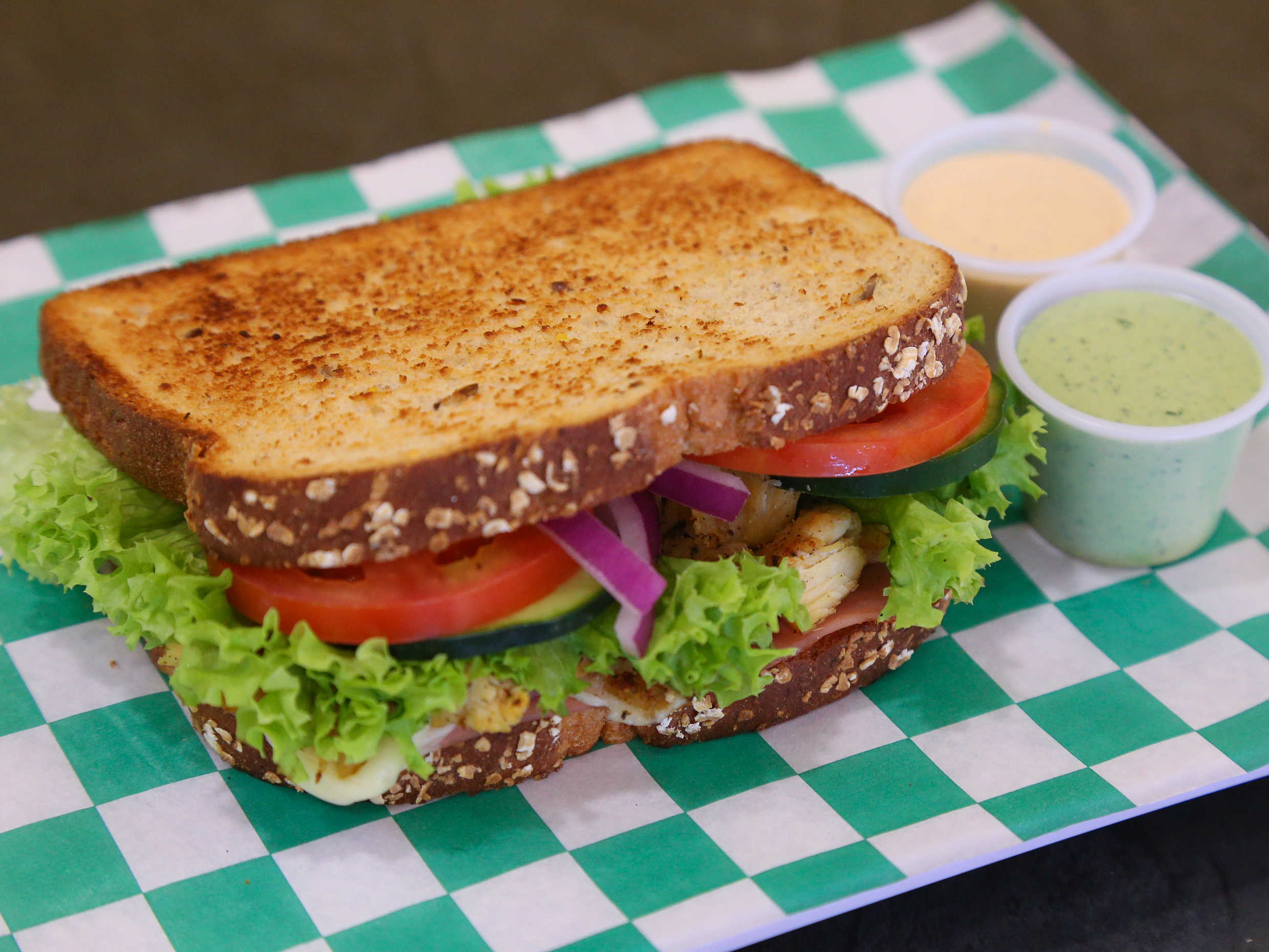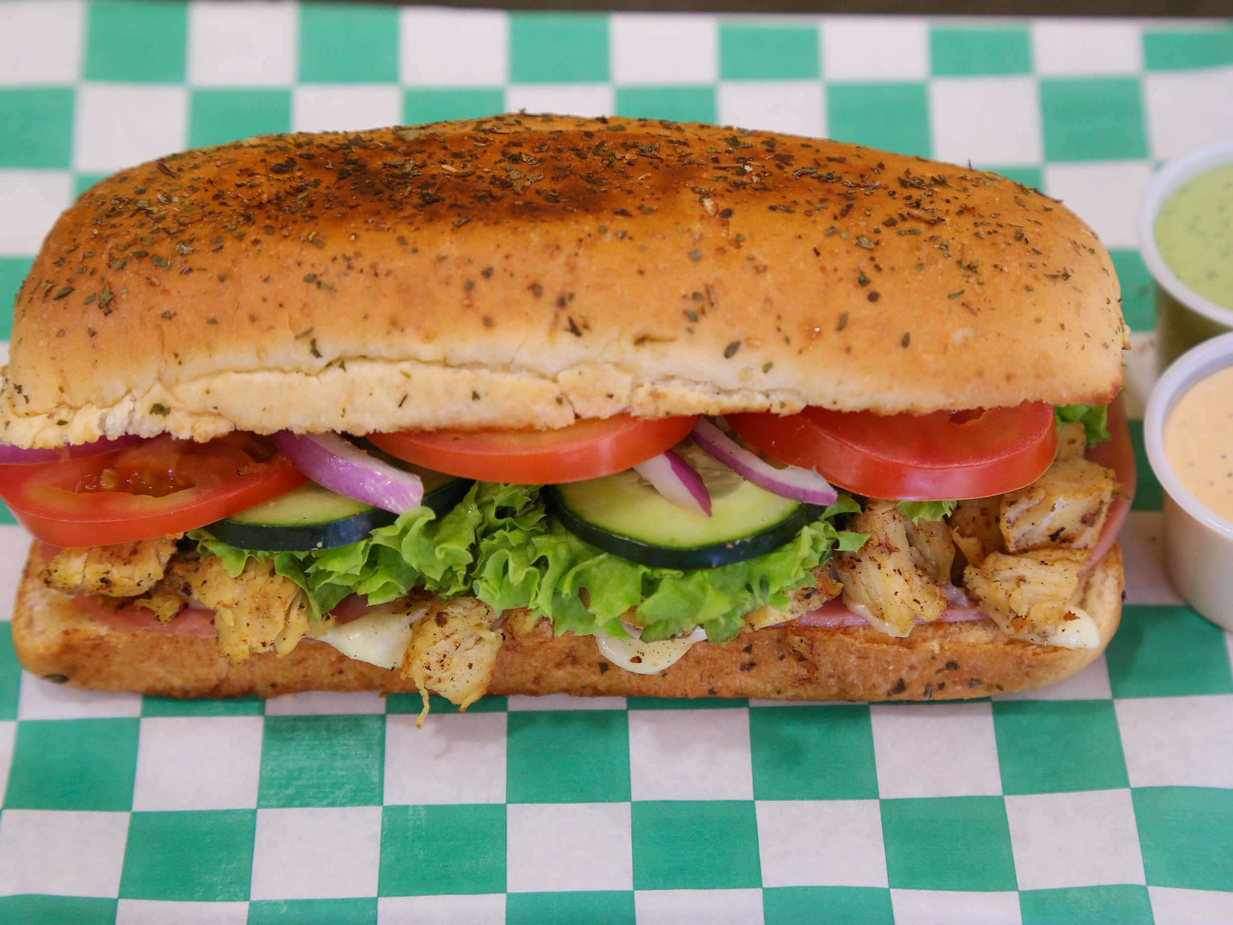(Pollo a la plancha, jamón, queso suizo-americano, tomate, lechuga, pepino y cebolla).
