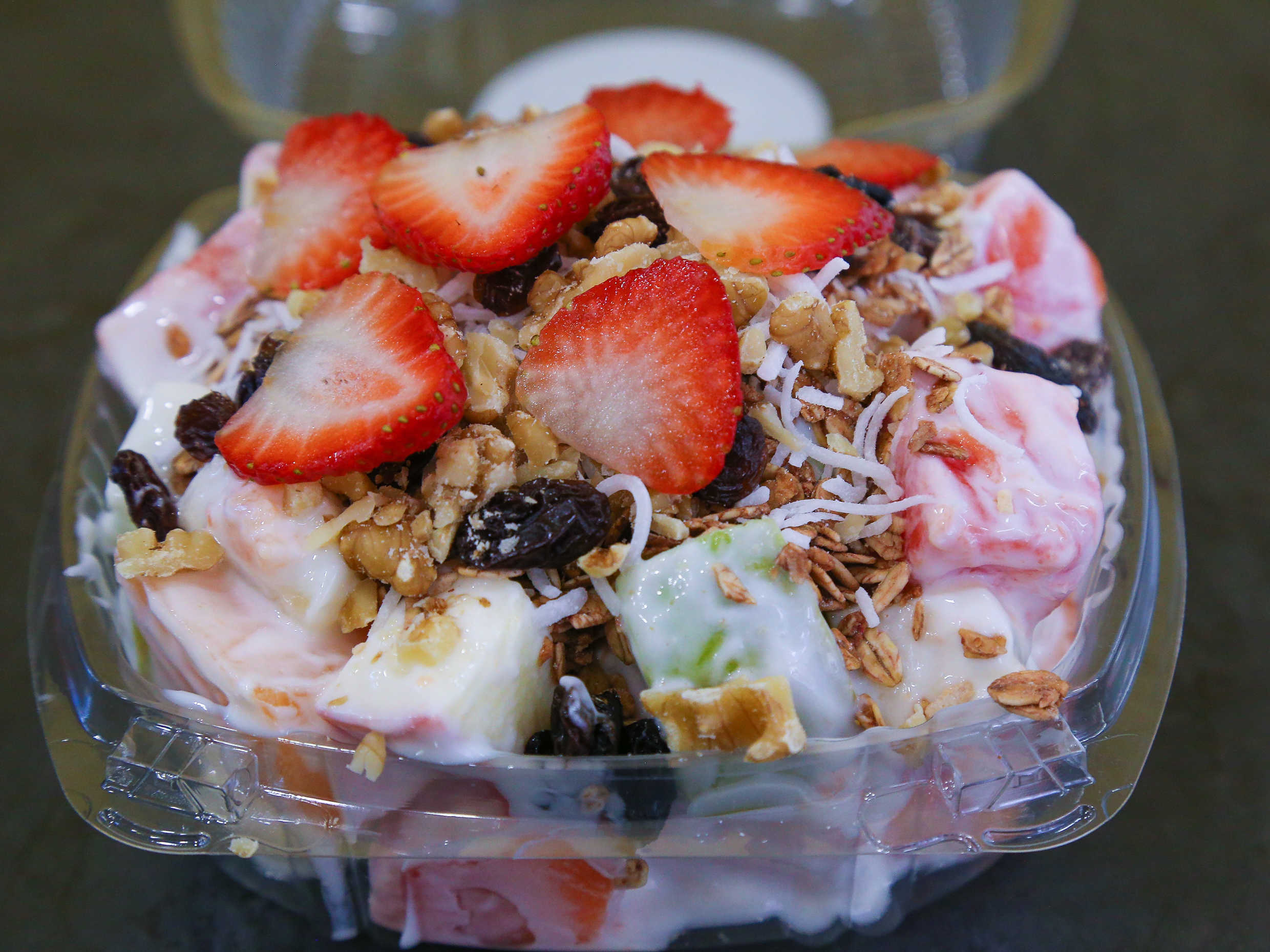 3 frutas a elegir (granola, coco rayado, pasas, nuez).