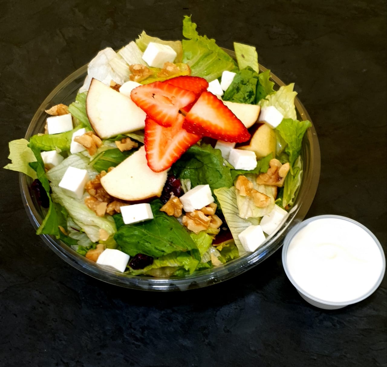 (Queso panela, lechuga, manzana roja, arándanos, fresa, nuez y salsa de yogurt).