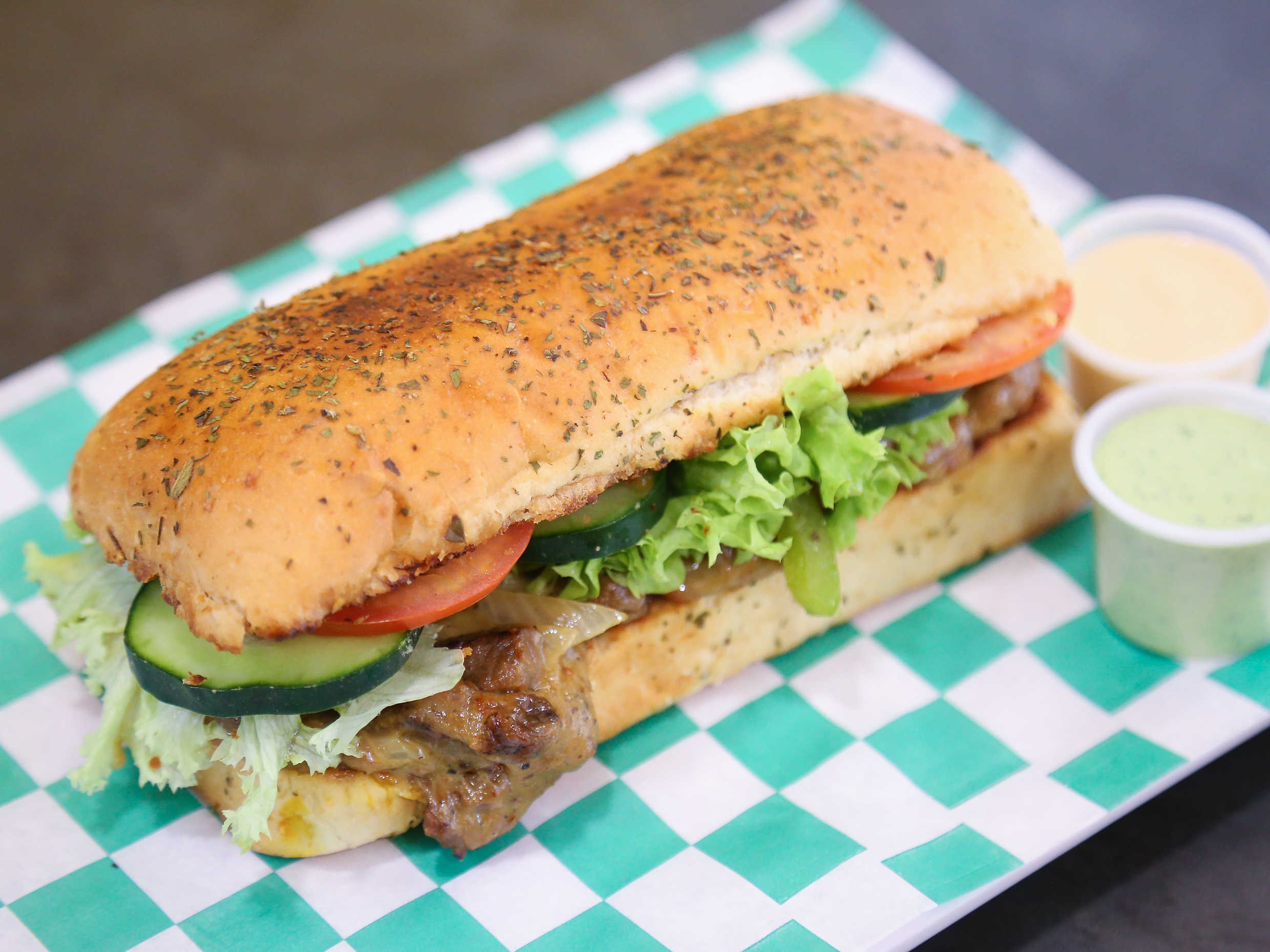 (Jamón, queso suizo-americano, tomate, lechuga, pepino y cebolla).