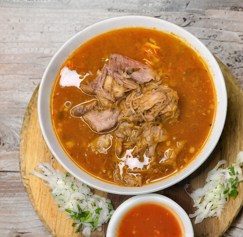 LITRO DE MENUDO, 1 PIEZA DE PAN, CEBOLLA CON CILANTRO Y SALSA