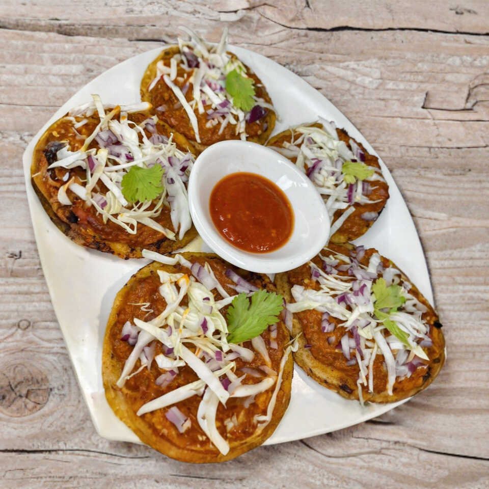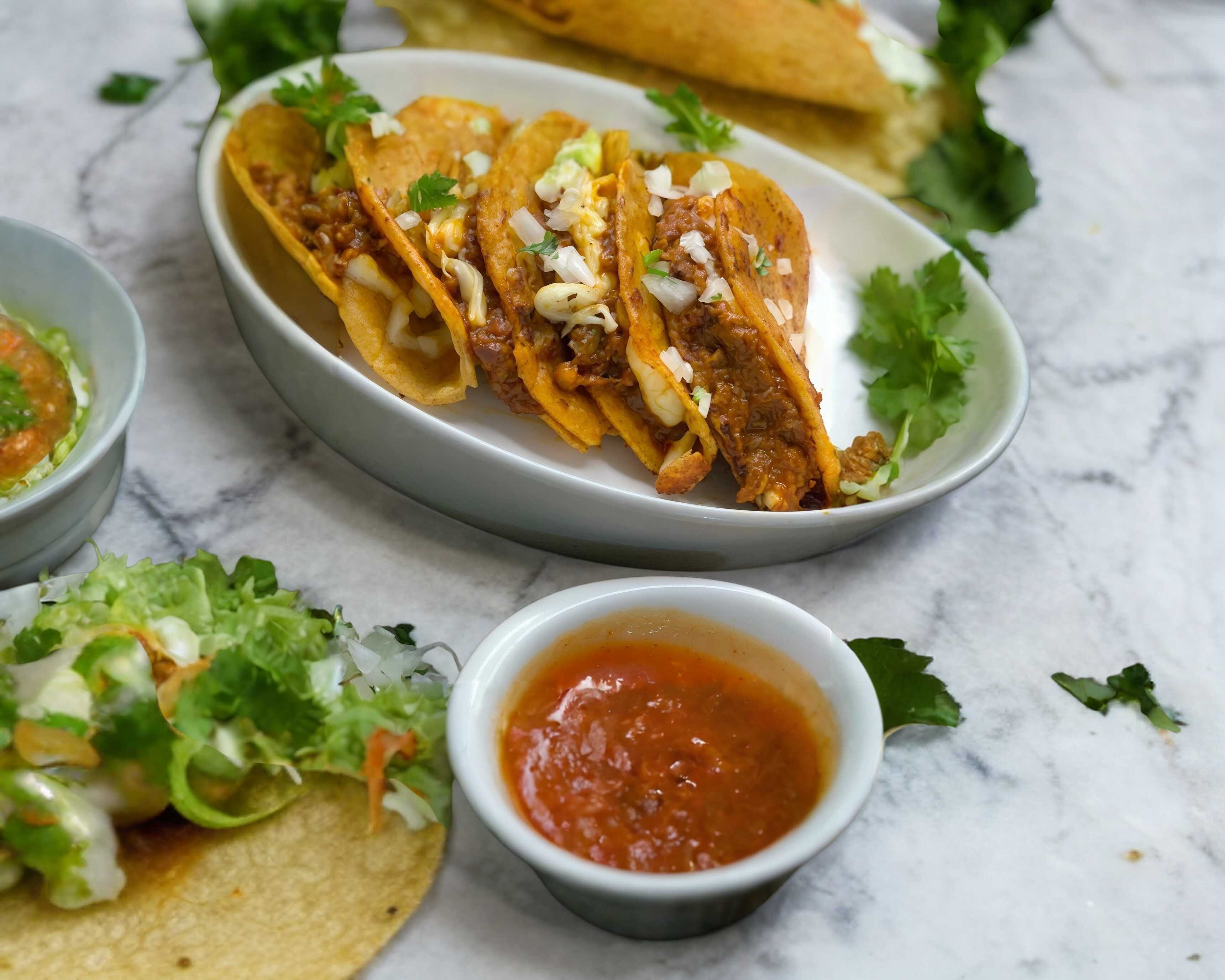 5 Tacos de guisado con birria Incluye salsas, cebolla, cilantro