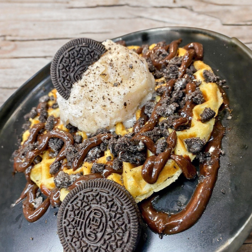 WAFFLE CON NUTELLA, GALLETA OREO Y NIEVE