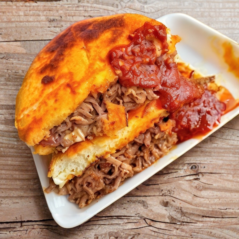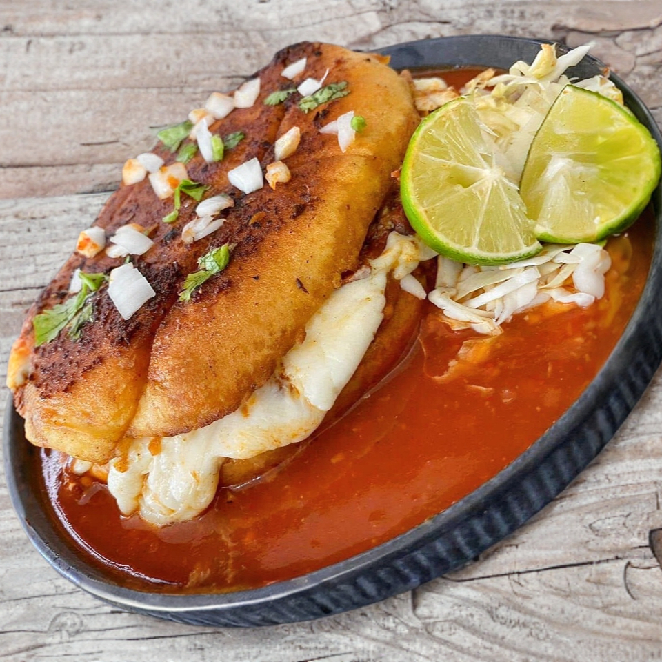 PAN DORADO, QUESO, BIRRIA, REPOLLO, CREMA DE CILANTRO