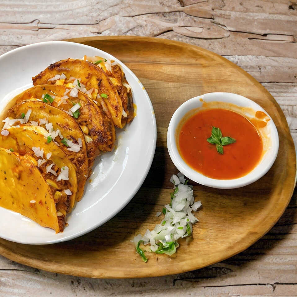 5 TACOS BAÑADOS EN NUESTRA DELICIOSA SALSA, BIRRIA, QUESO, CREMA DE CILANTRO Y REPOLLO