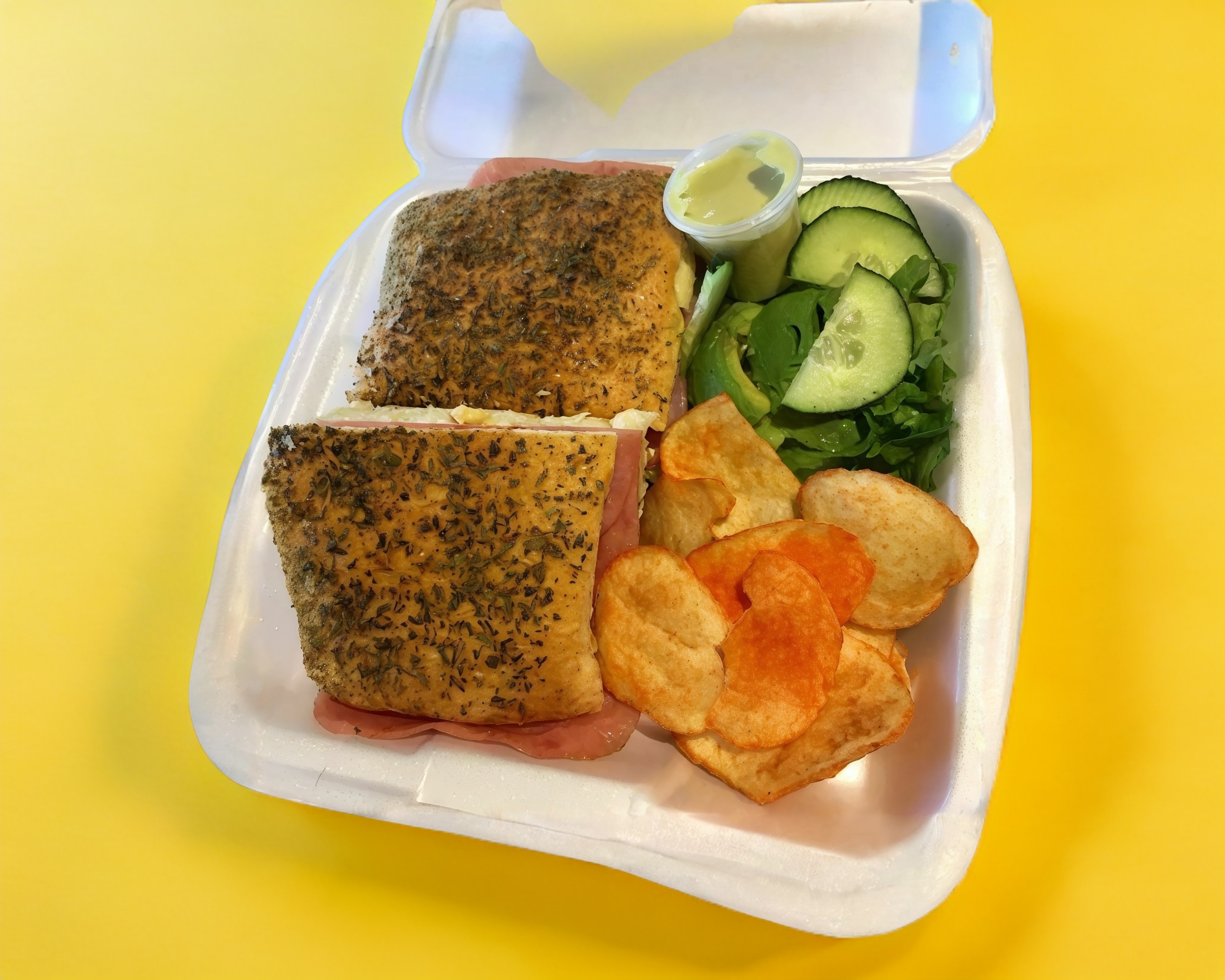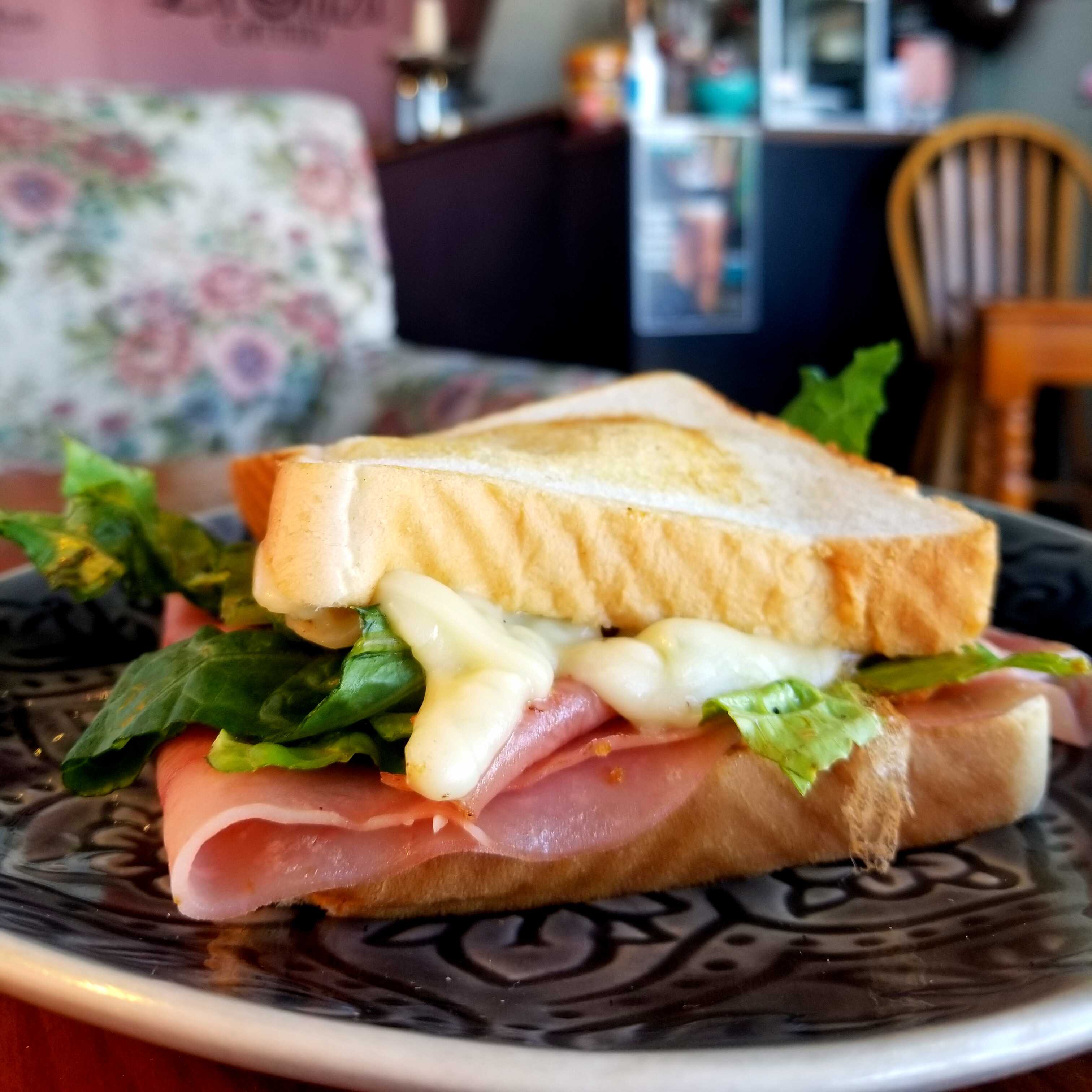 Pan Panini del día, jamón de pavo, queso blanco y mayonesa con chipotle.