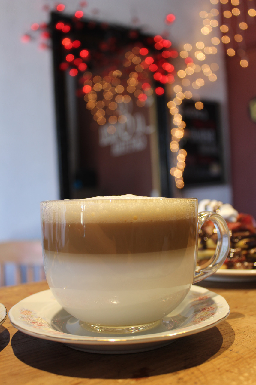 Leche espumosa con café expreso y un poco de canela encima. 12 oz.