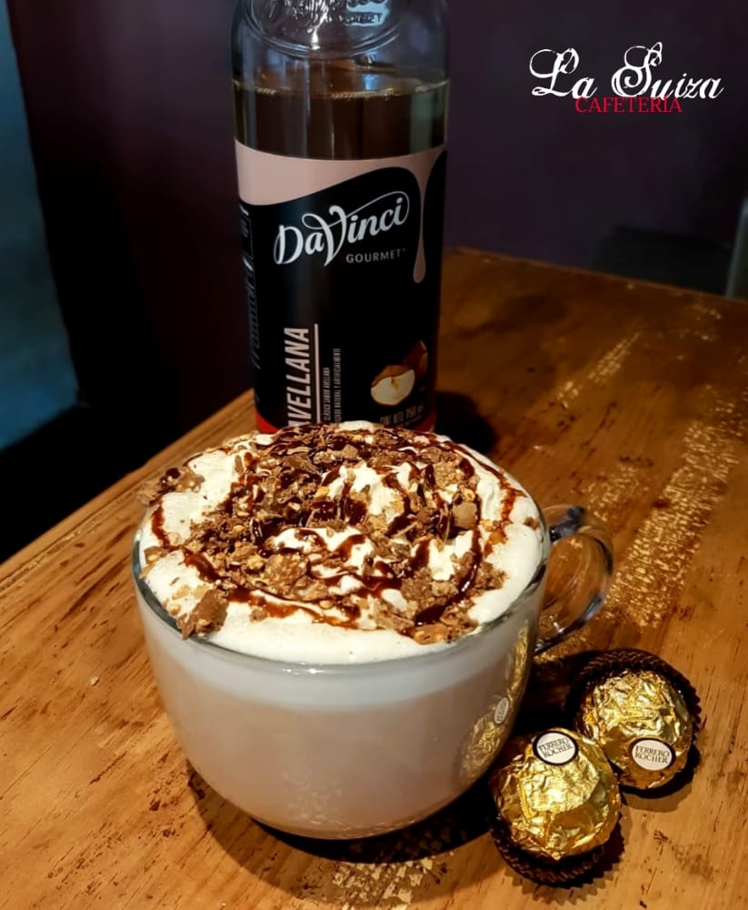 Capuchino sabor Ferrero con avellana, con crema batida y trozos de Ferrero. 12 oz.