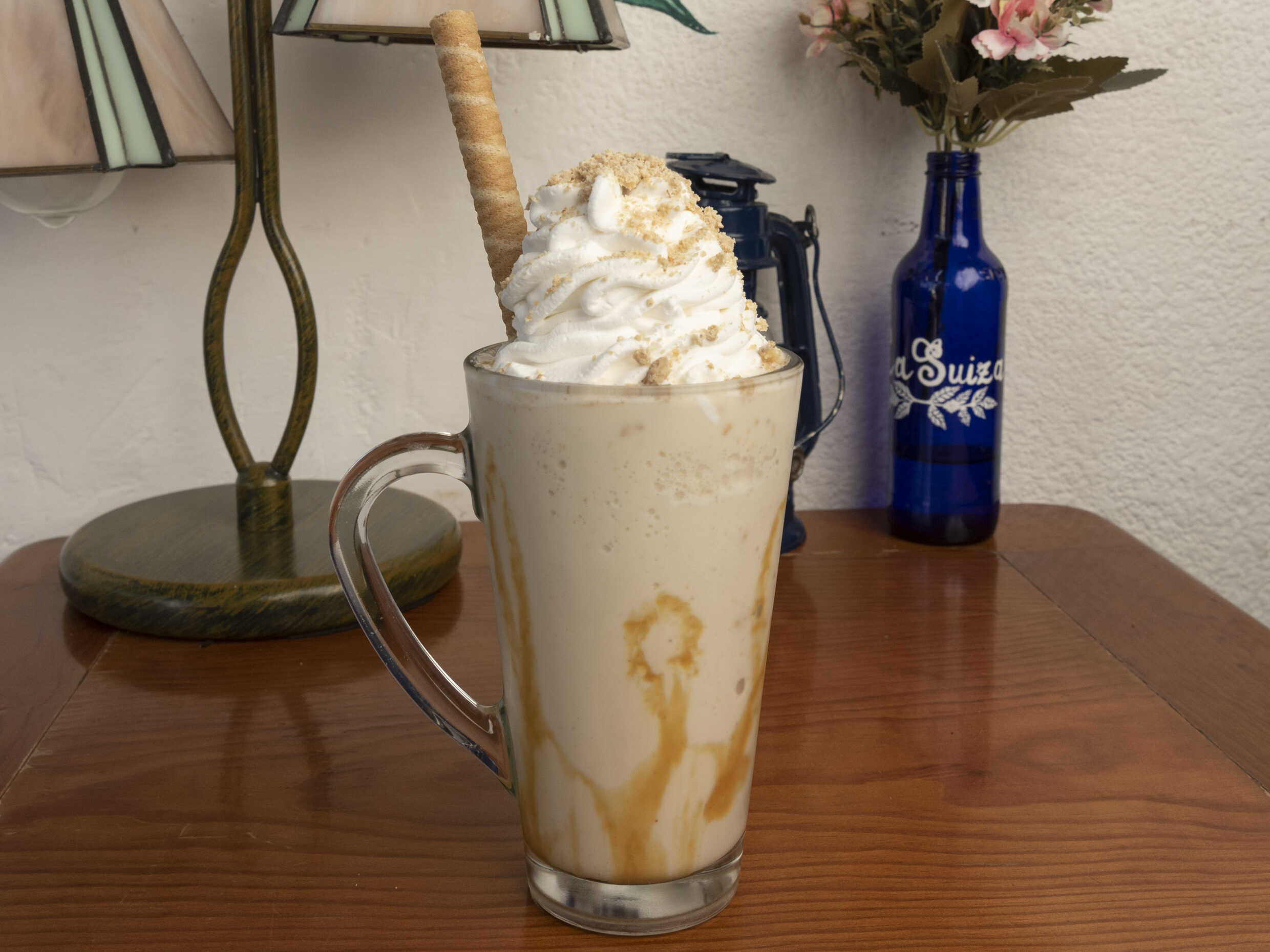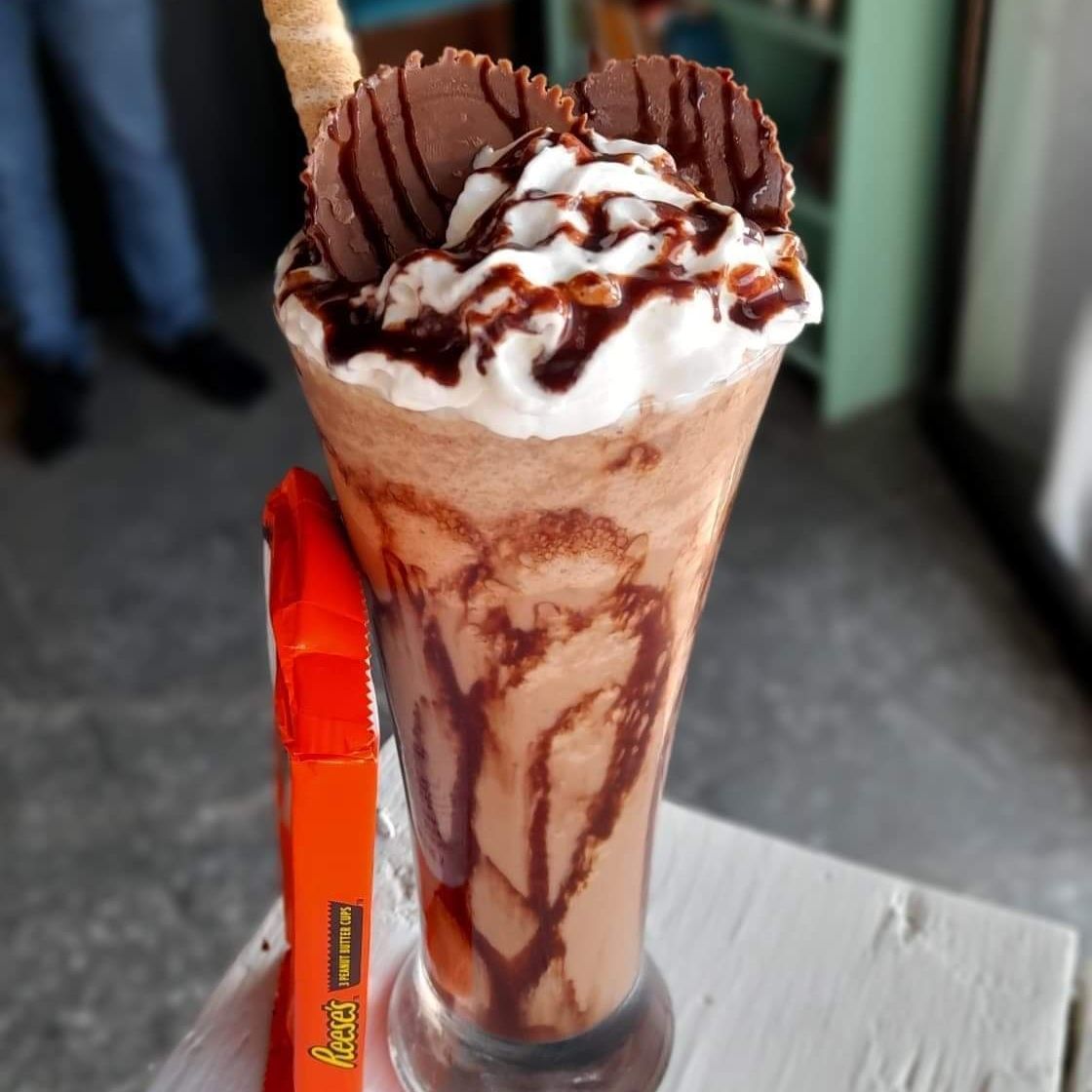 Frappé sabor Resse's y café, con crema de cacahuate y chocolate. 16 oz.