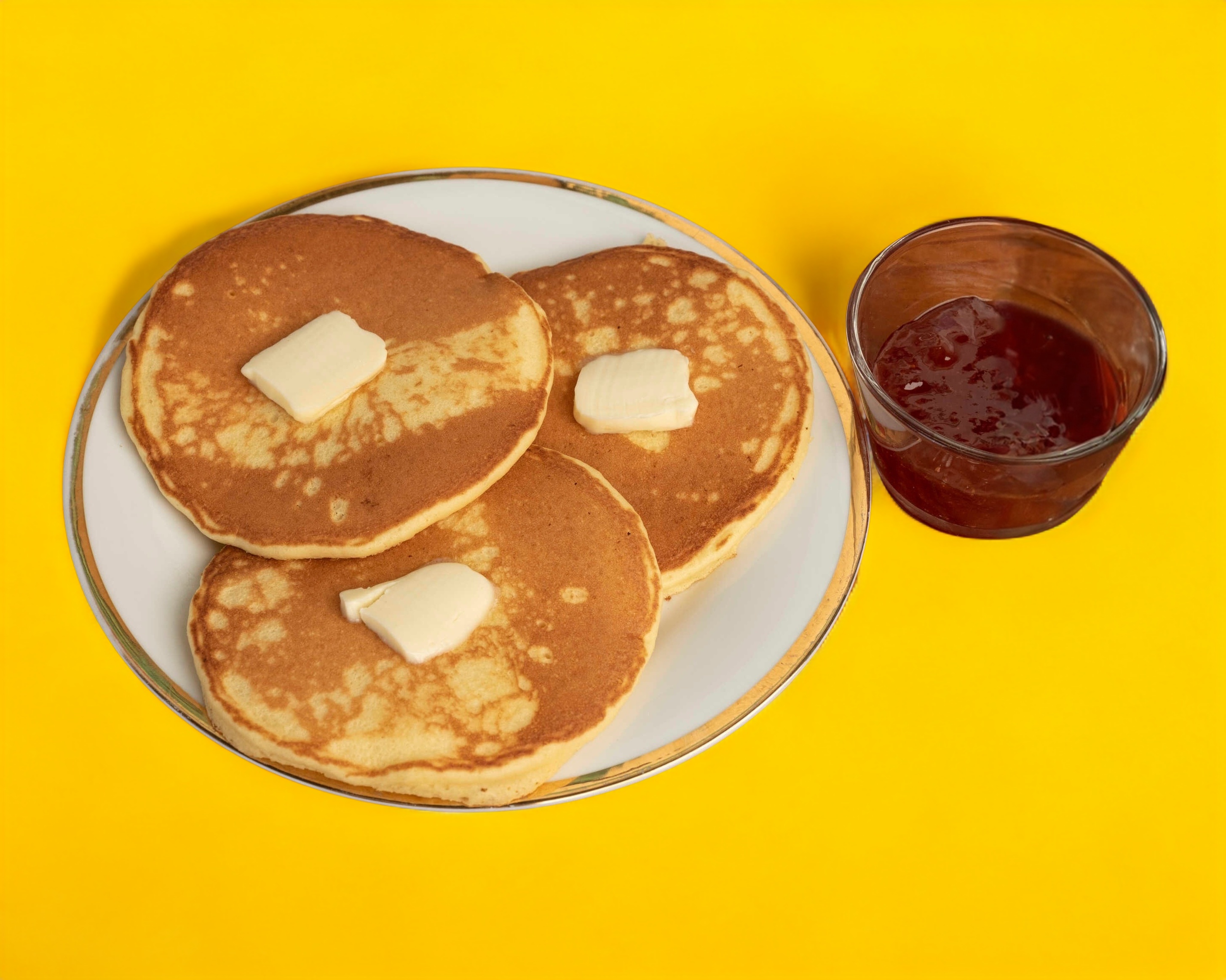 3 piezas de hotcakes de avena, acompañado de miel y plátano.