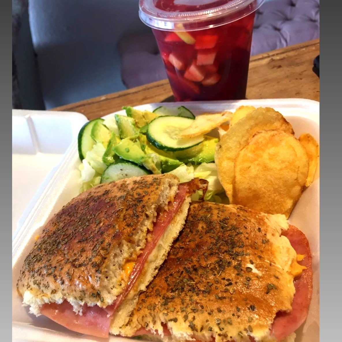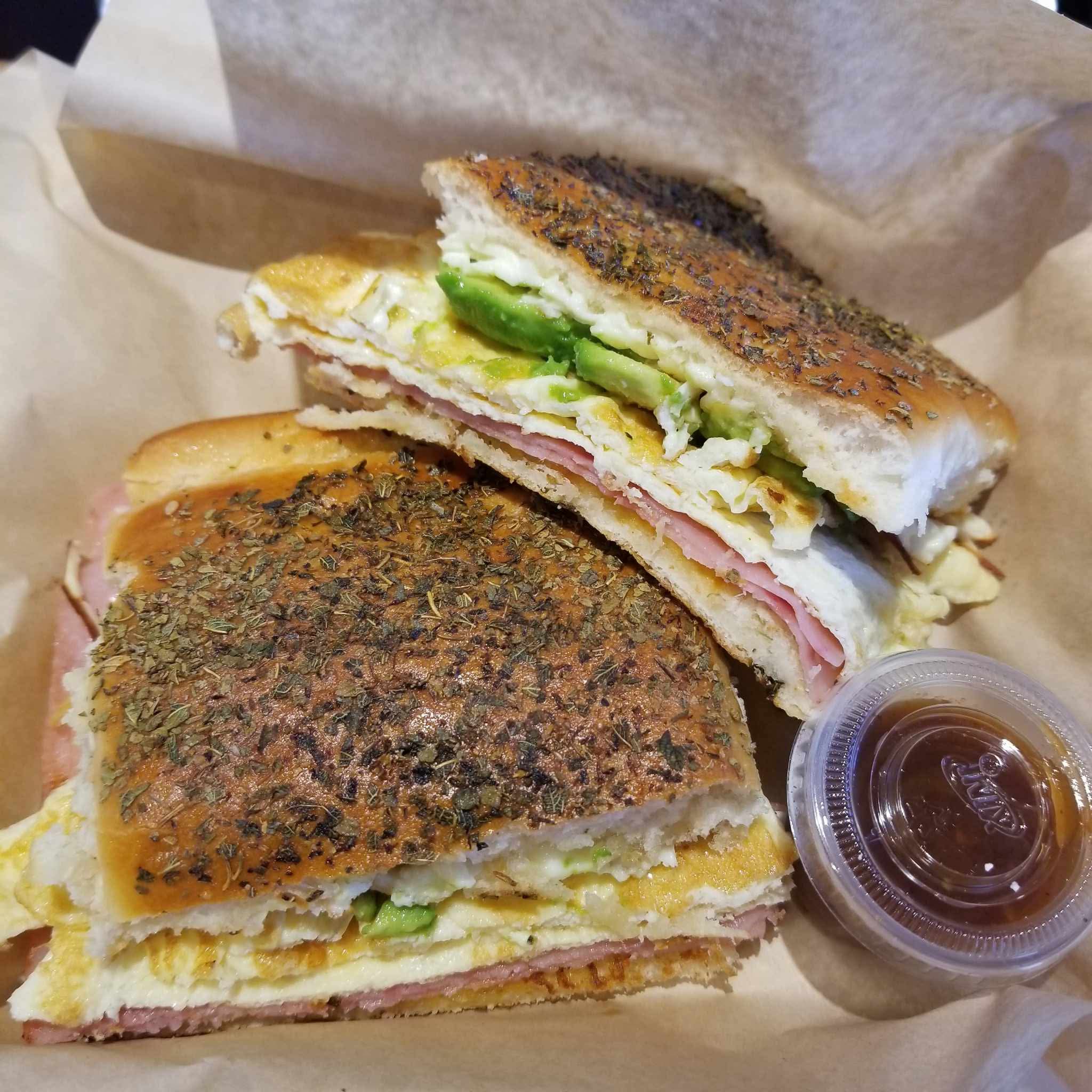 Pan Panini del dia, con jamón, 2 huevos revueltos, queso blanco, mayonesa chipotle. Acompañado de lechuga, aguacate y papas caseras.