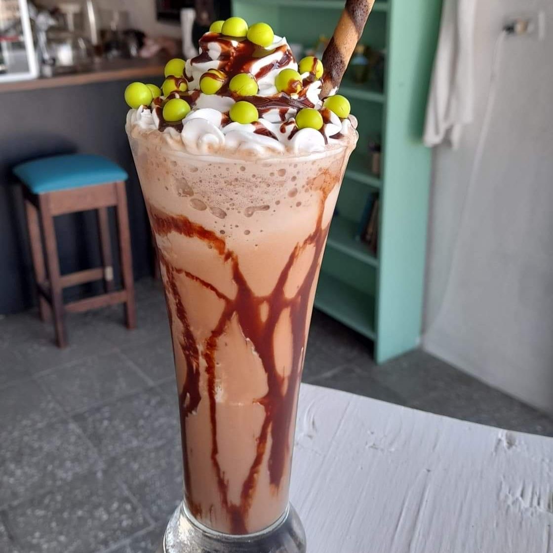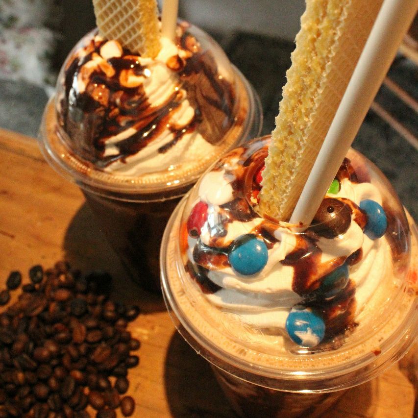 Frappé de café endulzado con Stevia, crema batida. Decorado con chocolate en el vaso.16 oz.