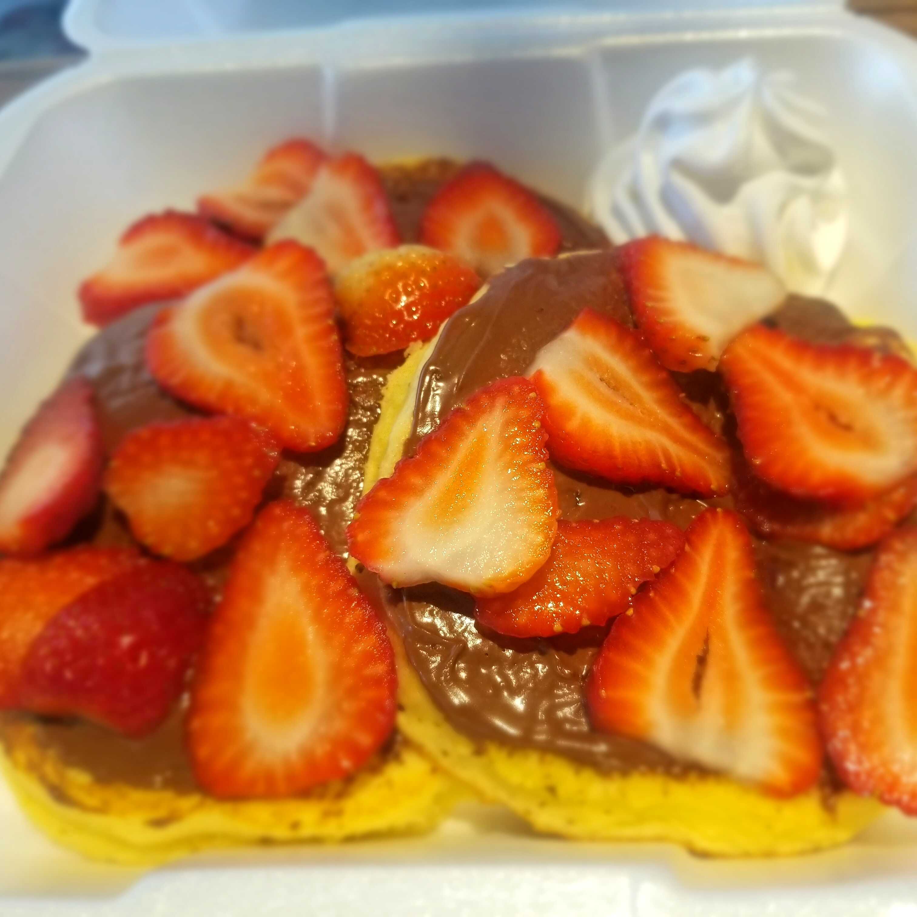 Con chocolate nutella, crema batida y fruta, 3 piezas.