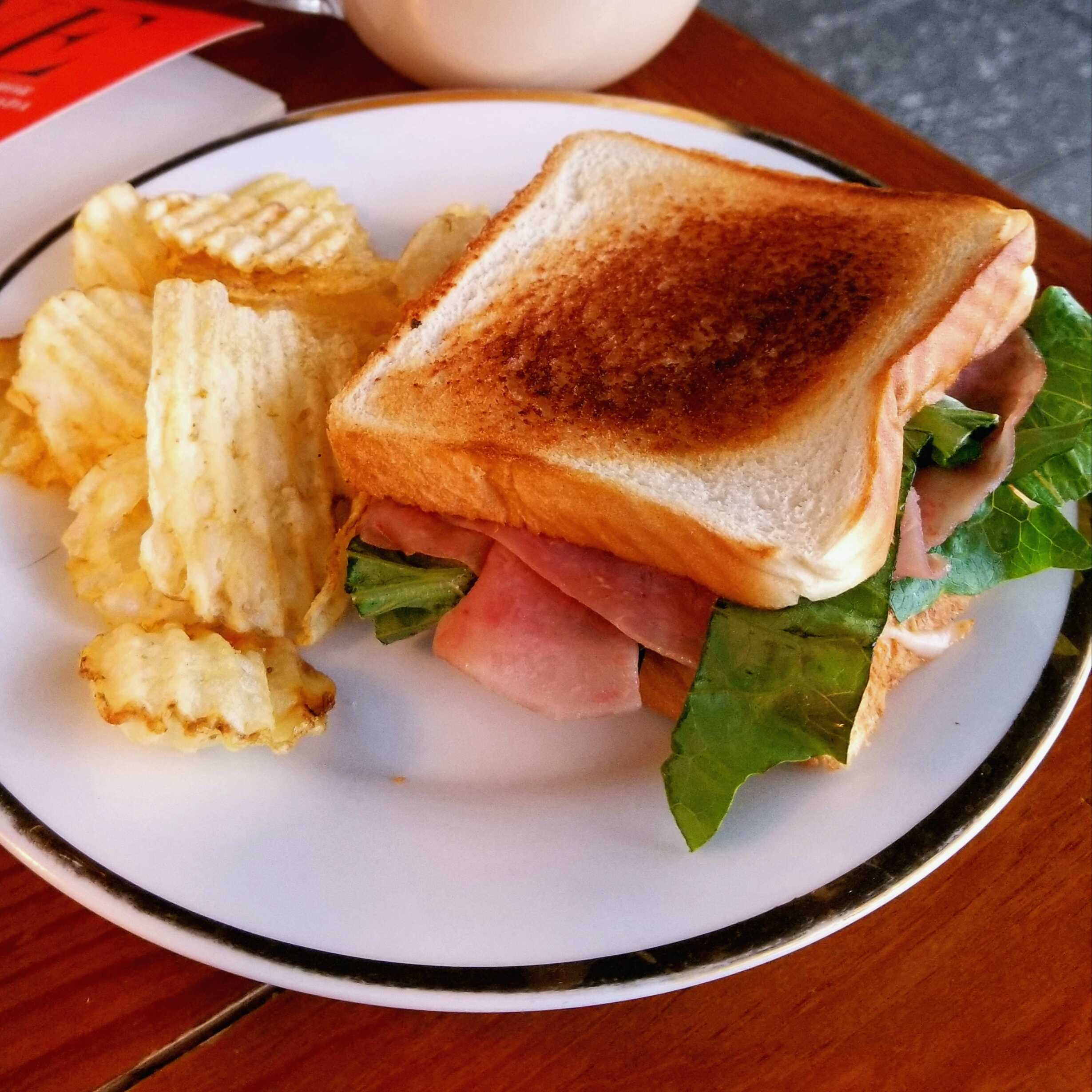 Pan de caja con mantequilla, jamón de pavo y queso blanco.