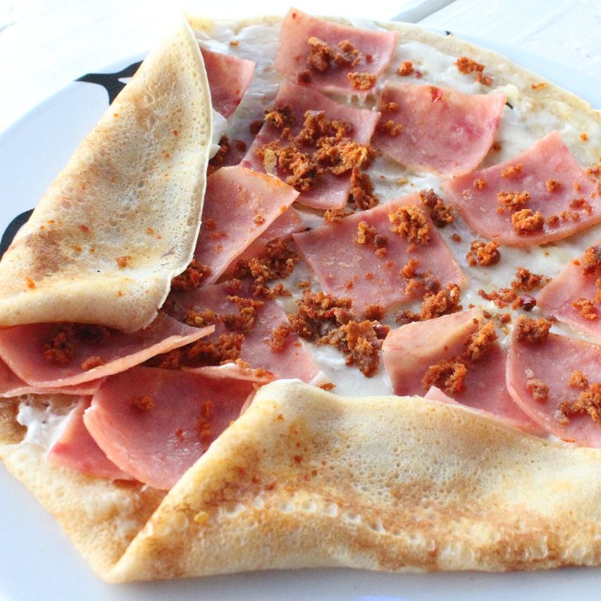 Deliciosa crepa salada con jamón, queso blanco, philadelphia, chorizo y salsa chipotle.