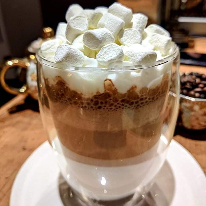 Expreso, leche entera lala, hielo frappeado, crema batida y con chocolate adornando el vaso. 16 oz.