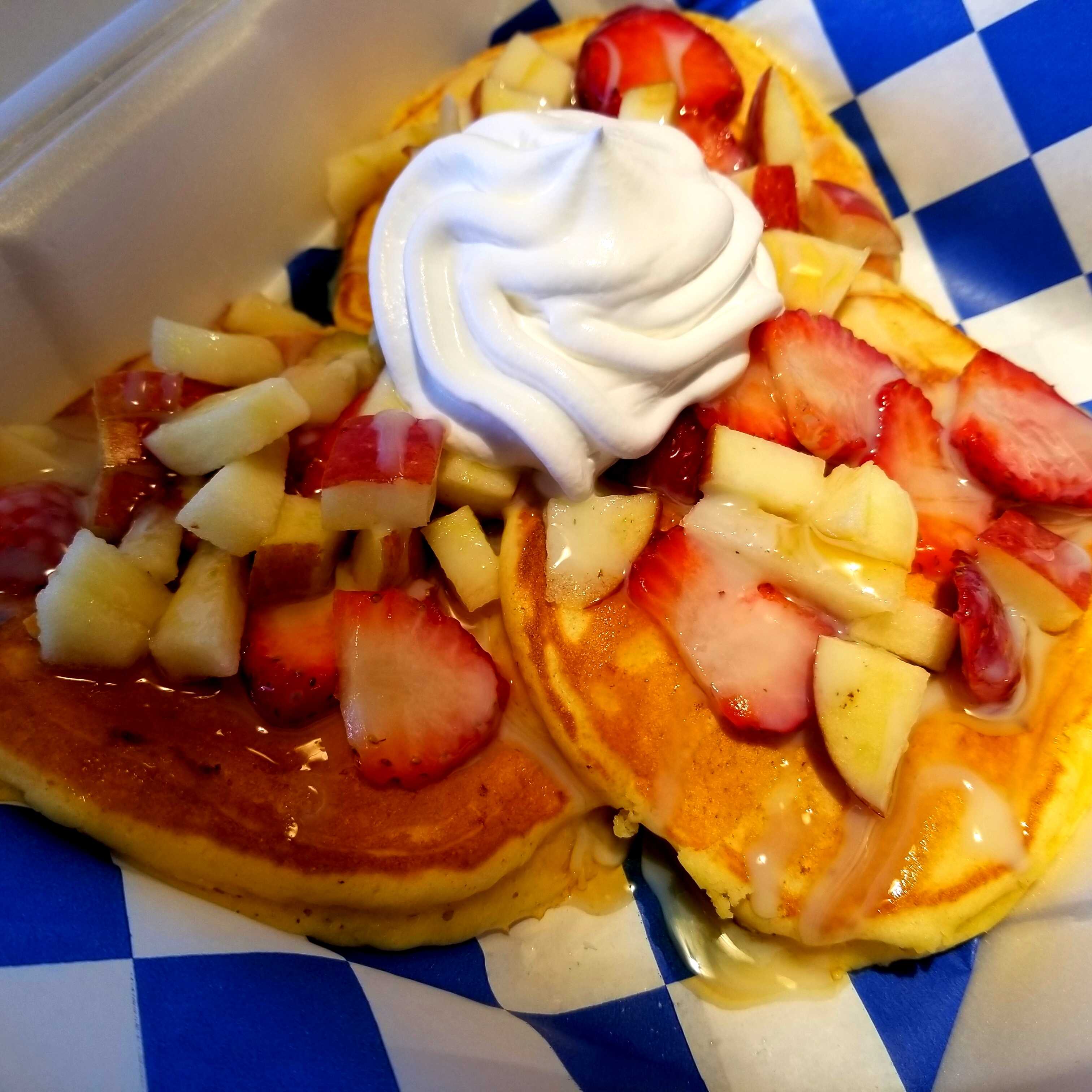 3 piezas de hotcakes con fresa, manzana, lechera y miel.
