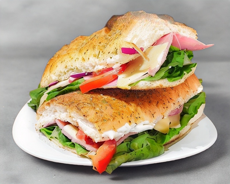 Lechuga, jamón, queso cheddar, mayonesa, tomate, cebolla morada, aceituna negra.