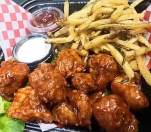 Boneless 200gr (8-10pz) En 1 salsa, acompañados con papas y de stik de zanah. /pepino y ranch