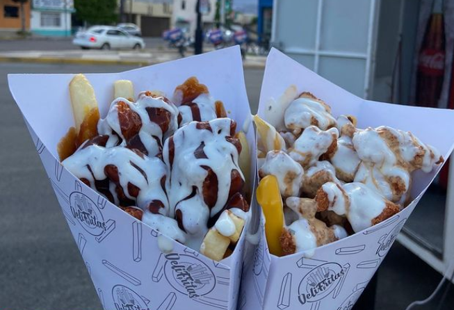 Papas francesas, queso amarillo, 3 porciones de proteína a elegir y 5 salsas a elección.