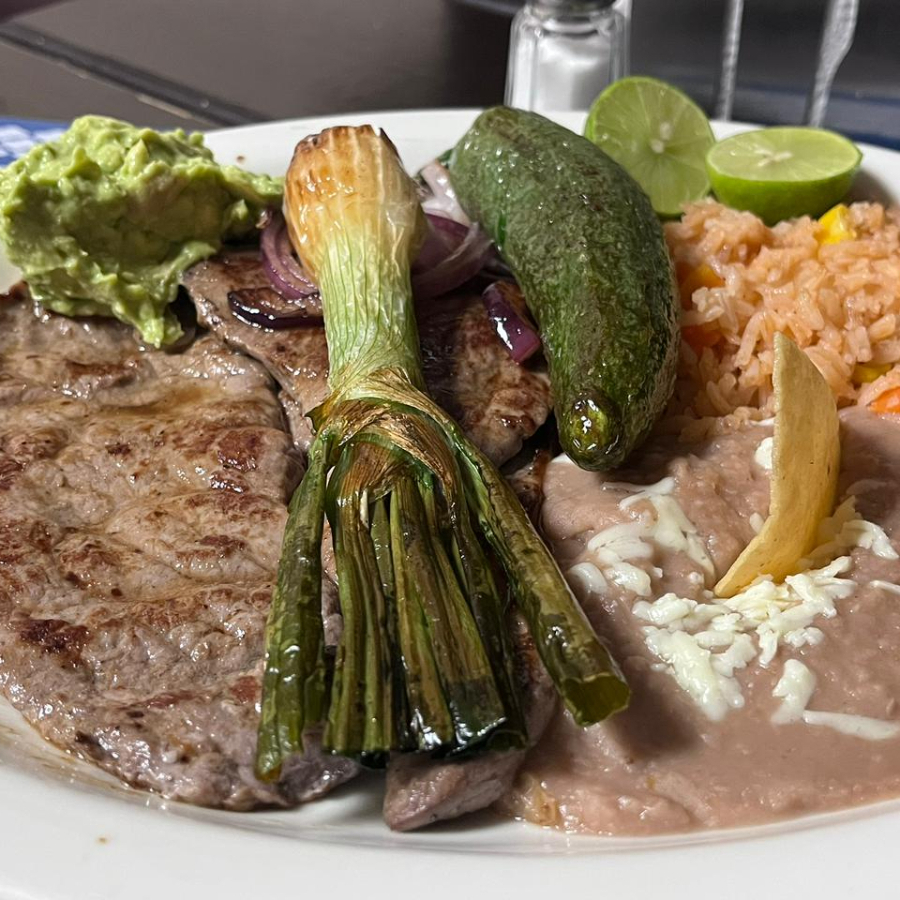 Sirloin, arrachera y pollo. Rajas de queso, chilacas, arroz y frijoles.