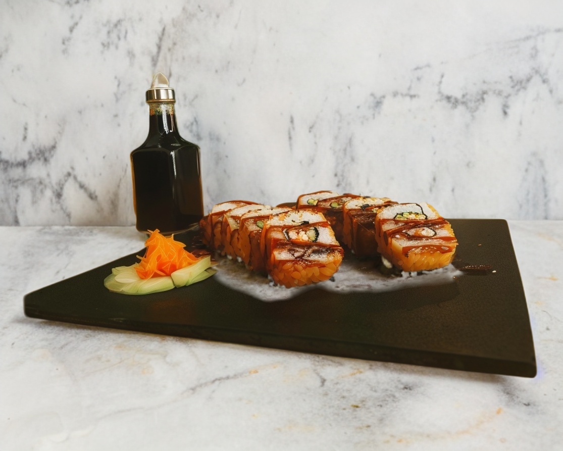 Camarón tempurado, aguacate, cangrejo y toreados, cubierto con queso crema y salmón fresco, bañado en salsa de anguila