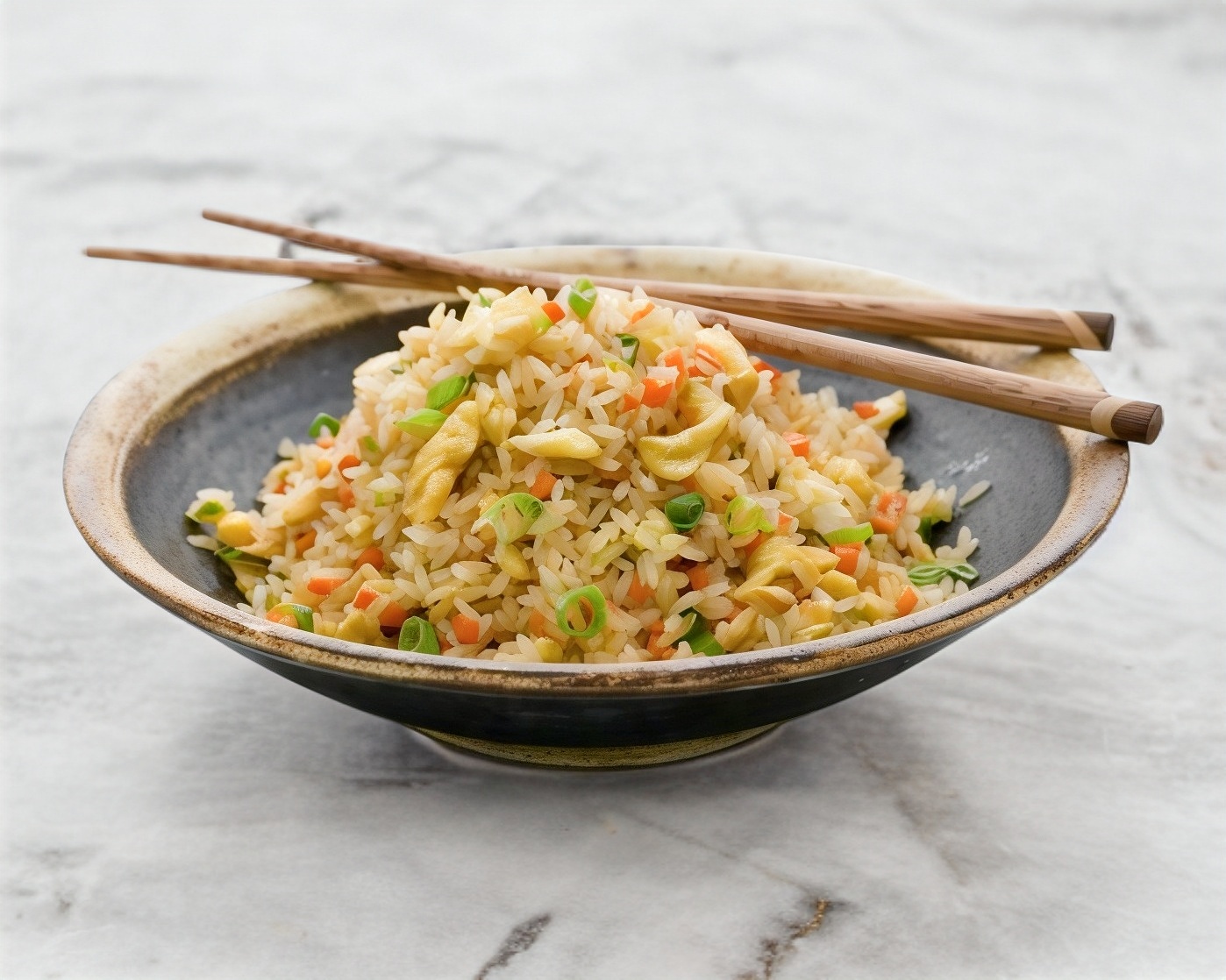 300 gr. de arroz frito acompañado de finas verduras, cebollín y especias.