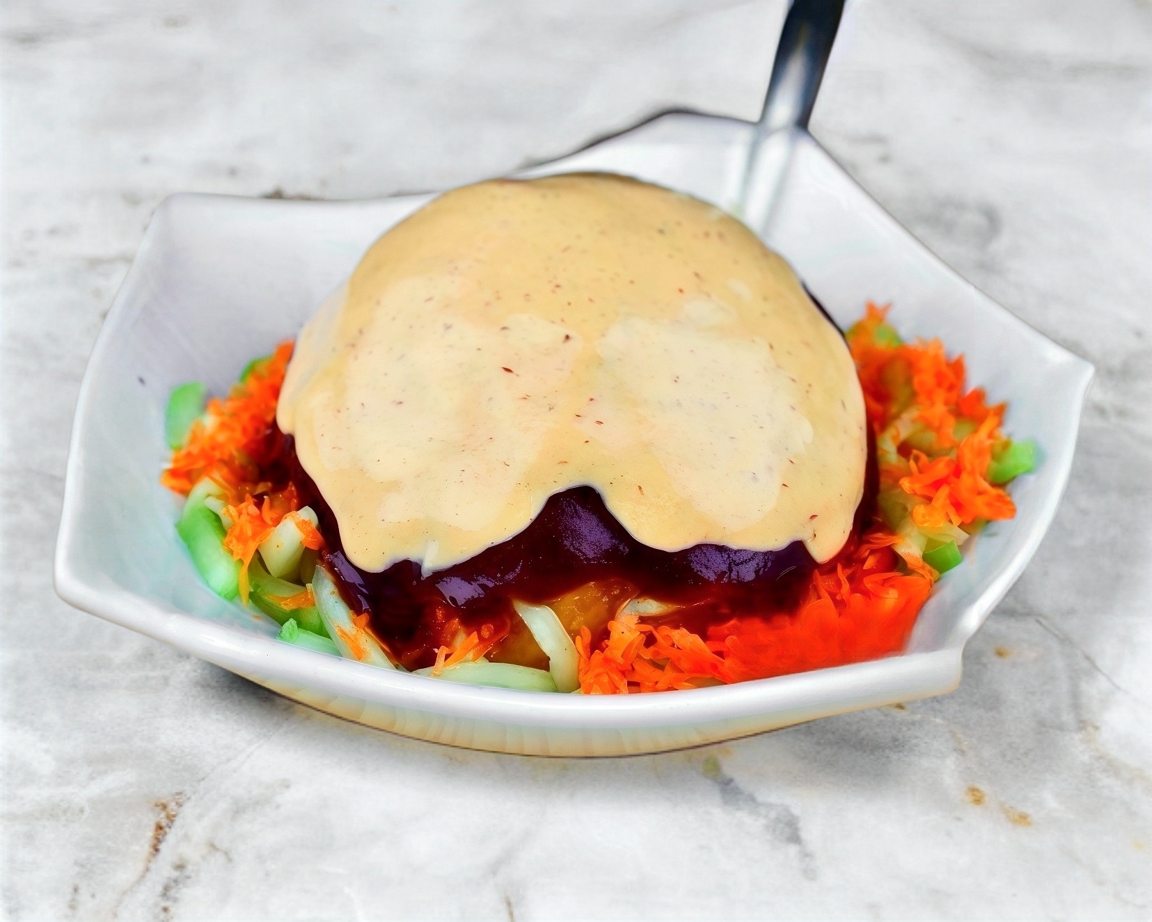 Queso crema, aguacate, camarón y pulpo, cubierto con finas tiras de salmón y salsa chipotle