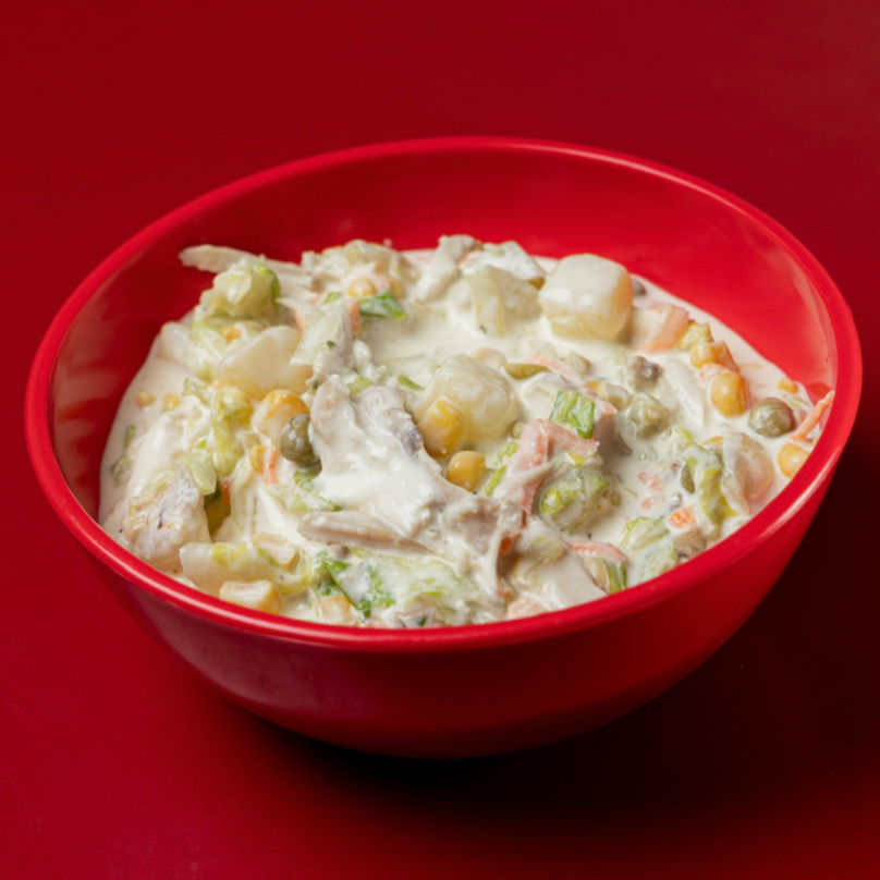 Ensalada de pollo (porción 1/4) con lechuga, chícharo, elote y mayonesa