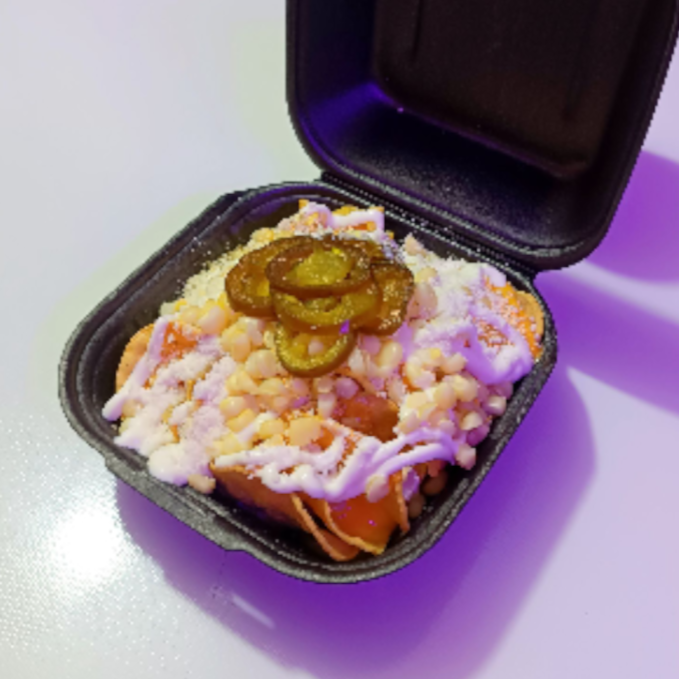 Totopos crujientes bañados con queso para nachos, queso granulado y elote dulce. Coronados con crema, Cheetos y jalapeños para ese golpe perfecto entre lo cremoso, lo picosito y lo crujiente. ¡Una bomba de sabor lista para compartir… o no! 😋🔥