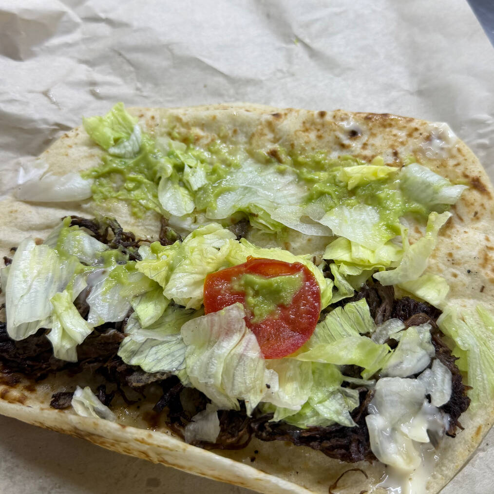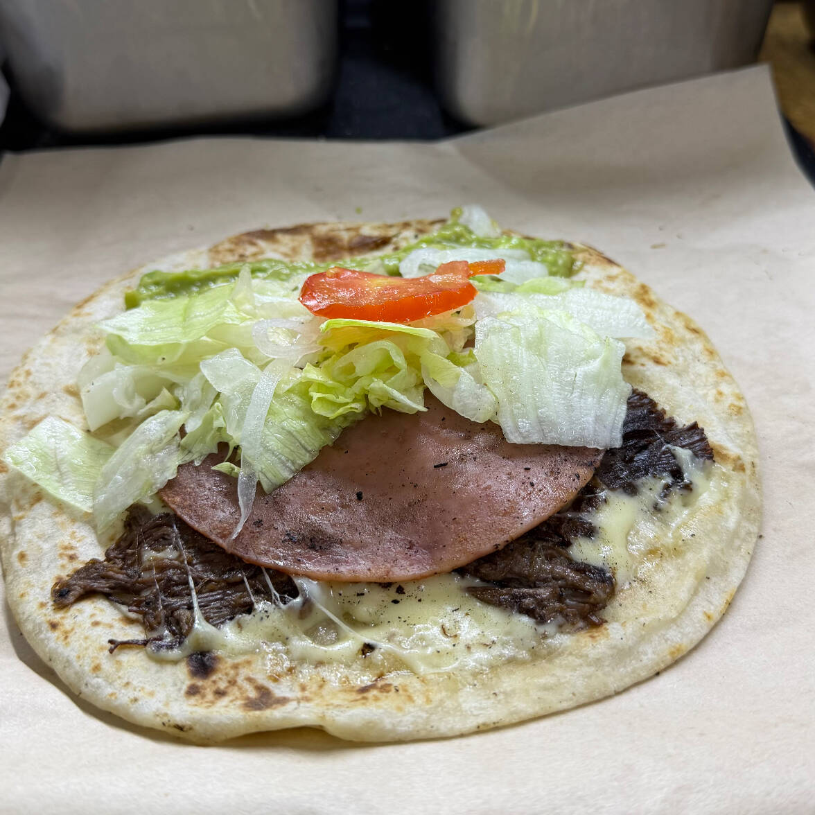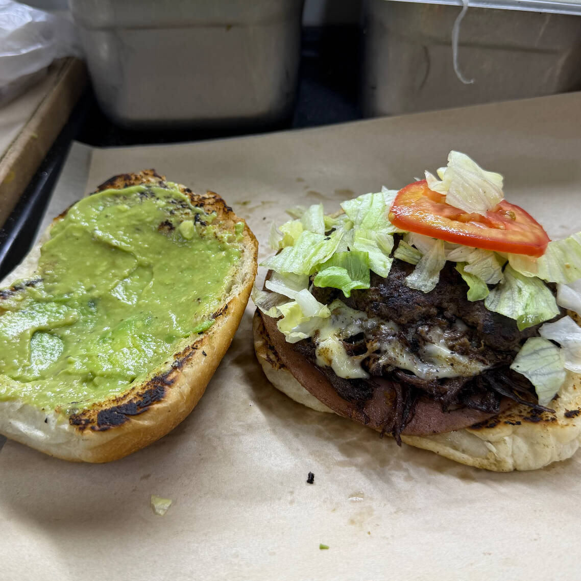carnede hamburgueza ,carne desebrada, quezo blanco, lechuga, tomate,cebolla y aguacate