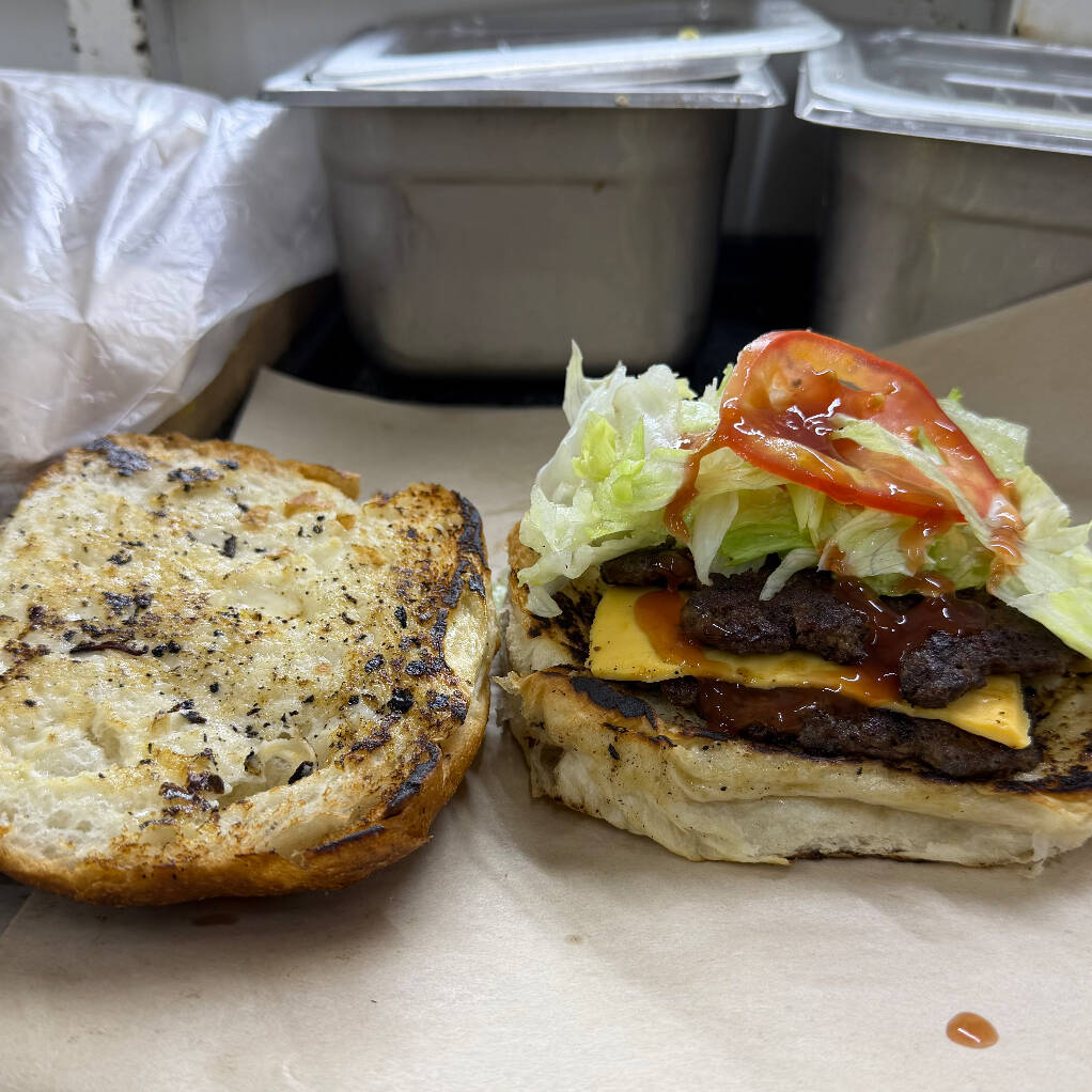 carnede rez, lechuga,tomate, cebolla, quezo amarillo y ketchup