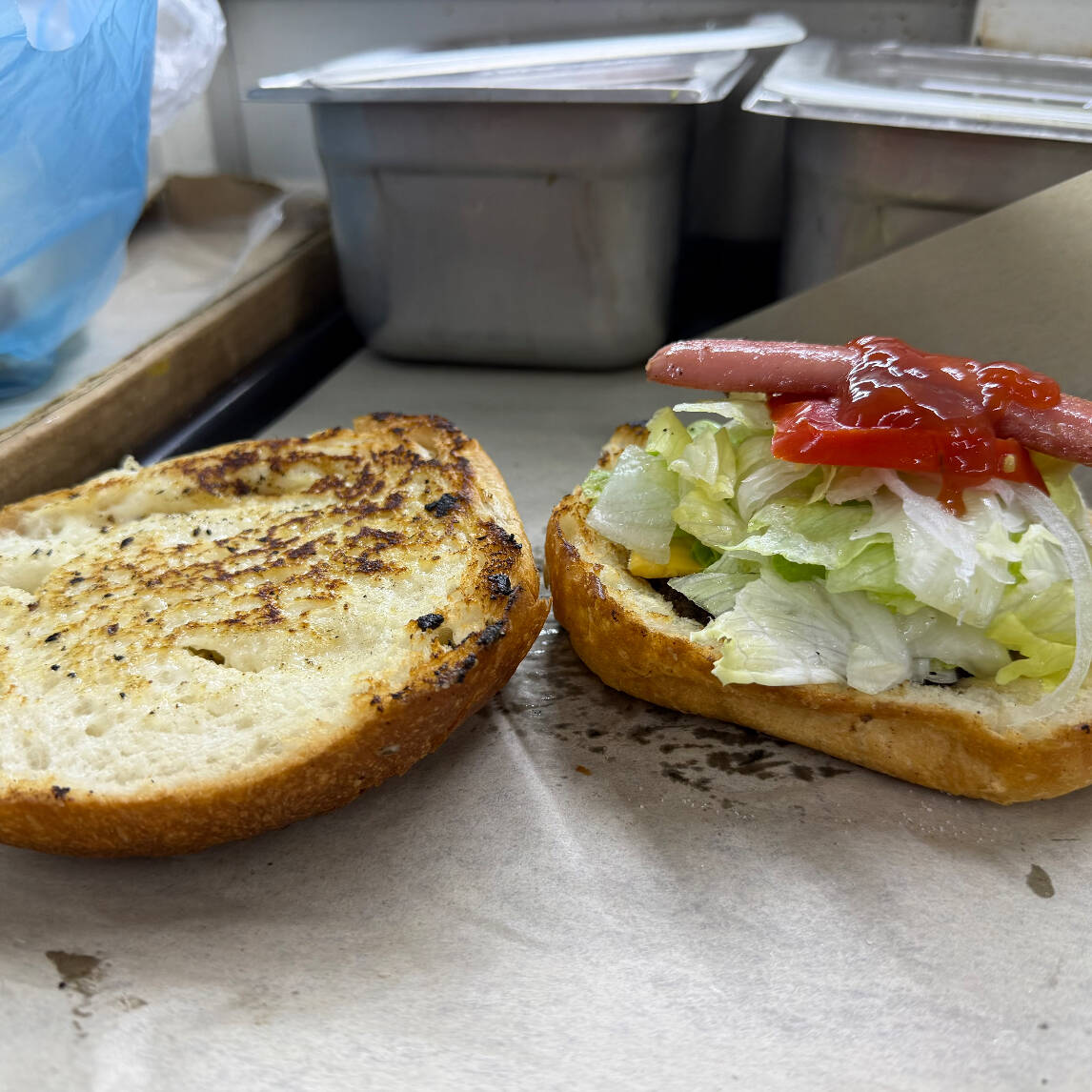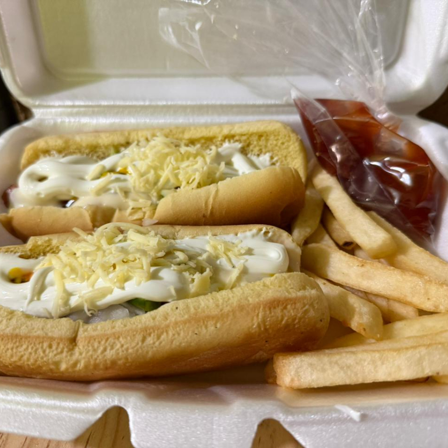 carne de res, winnie, lechuga,tomate,cebolla, ketchup y queso amarillo