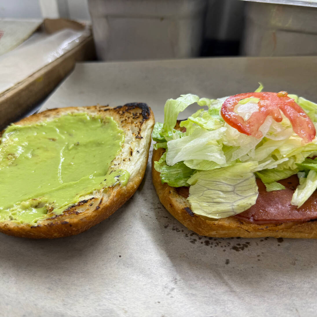 pan de hamburguza con salchicha, jamon, y quezo amarillo, lechuga, tomate, cebolla y aguacate