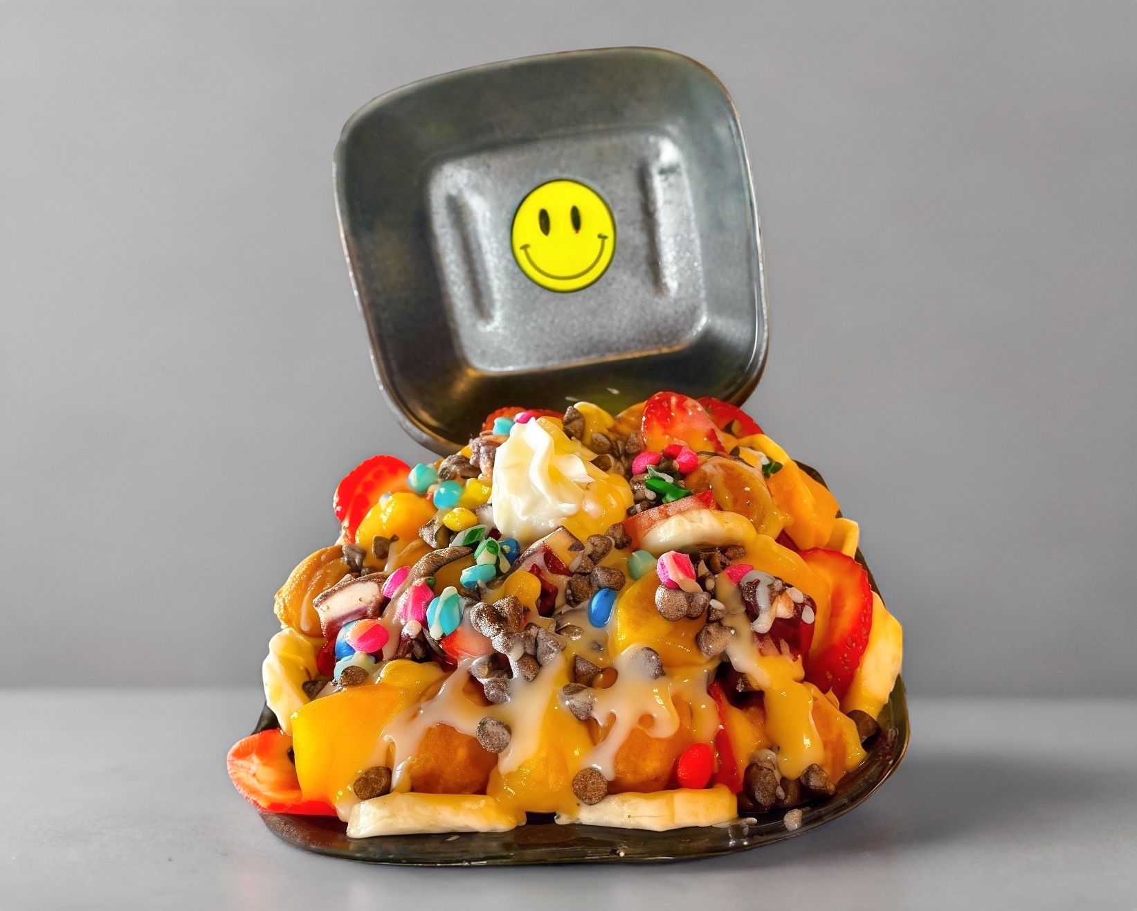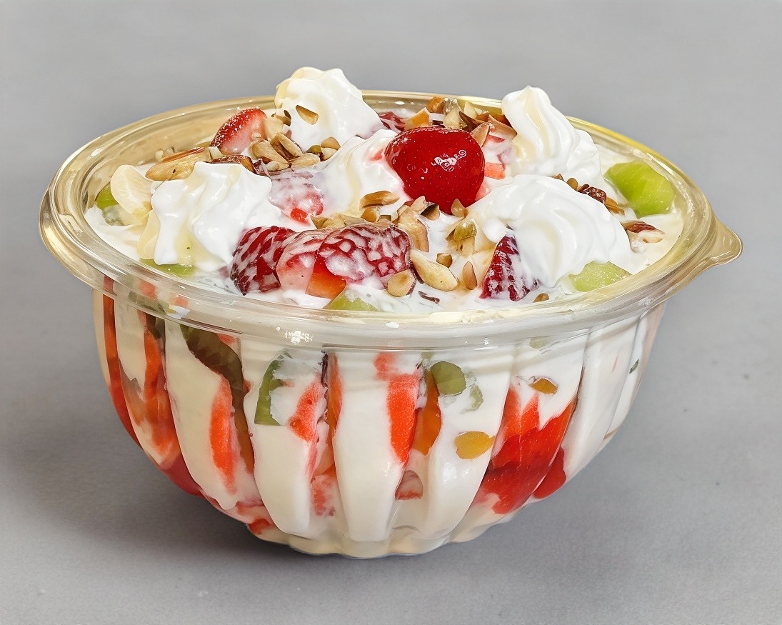 Coctel de frutas, con crema dulce, toppings y jarabe favoritos.