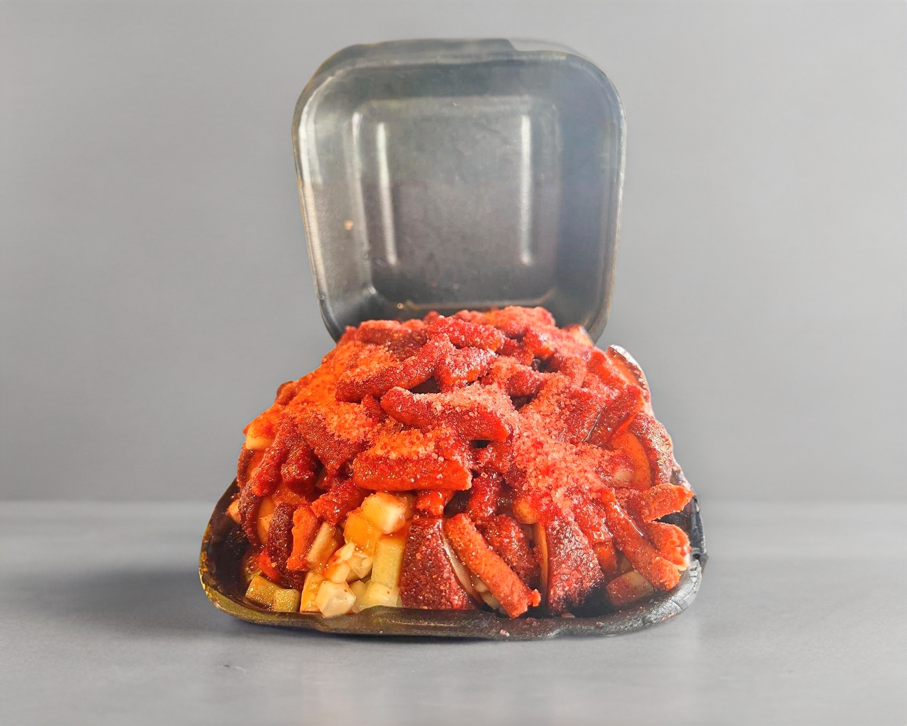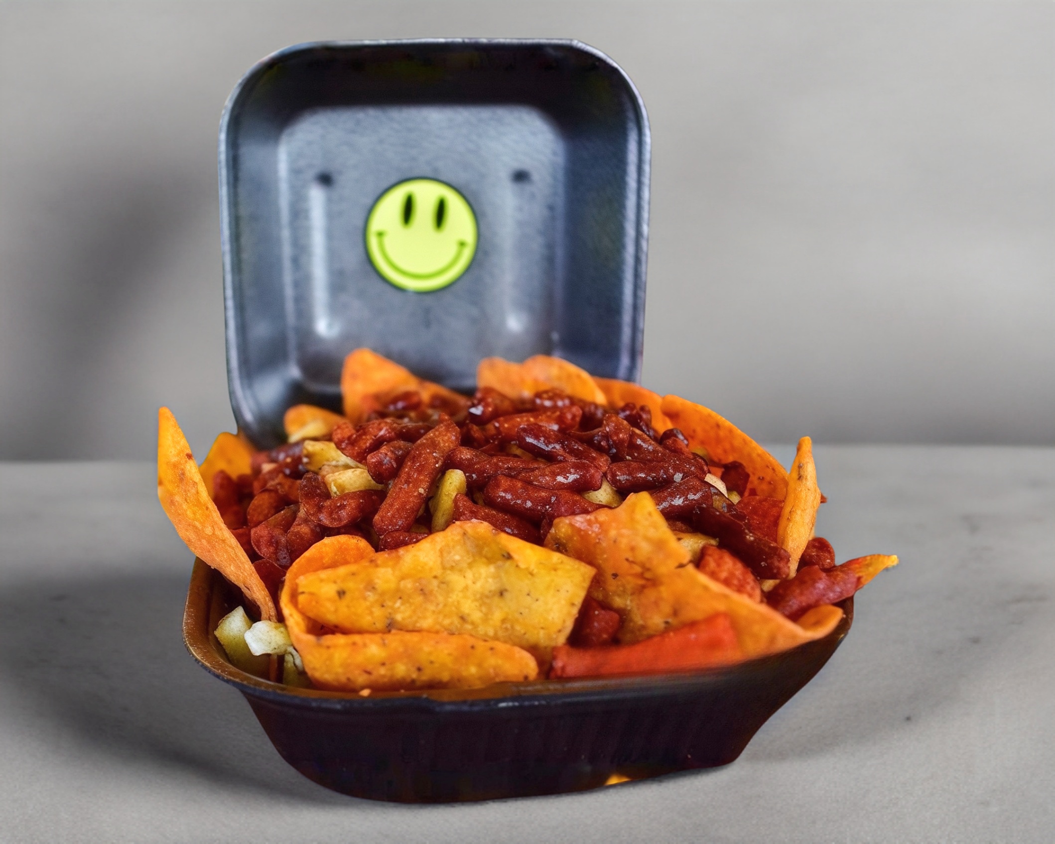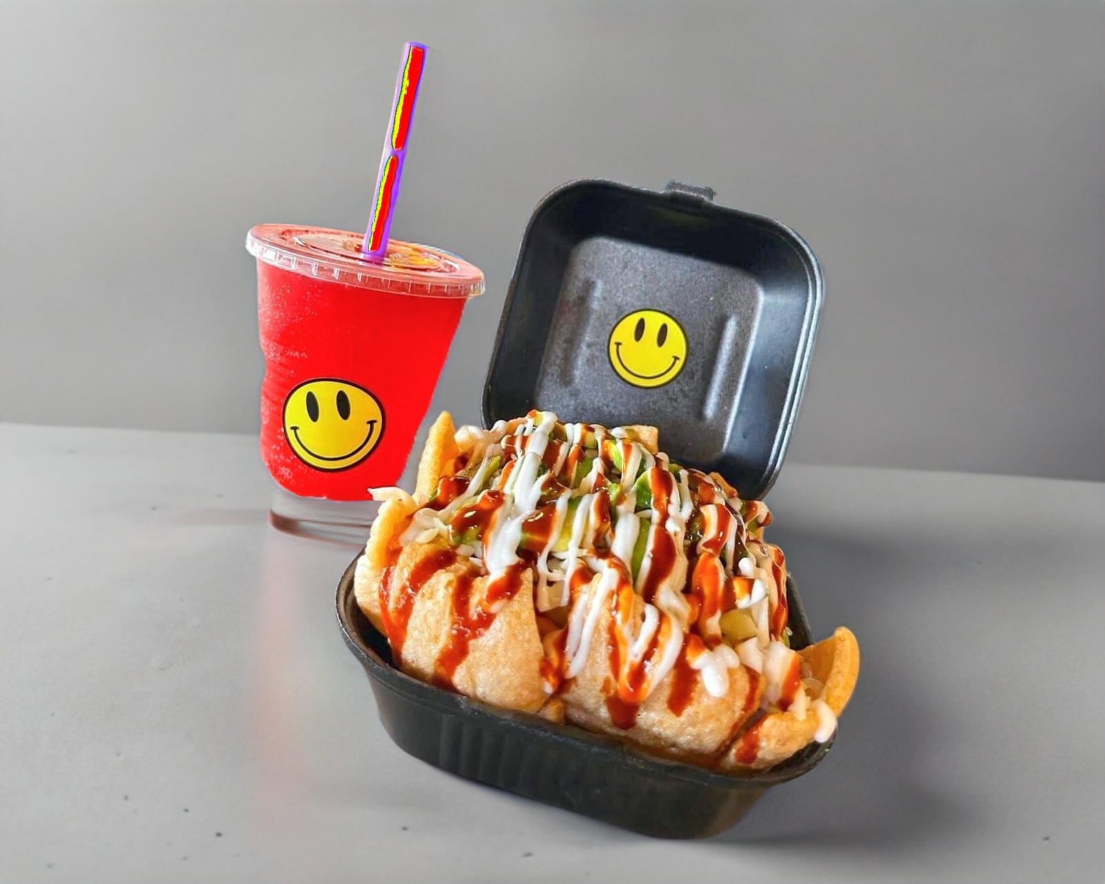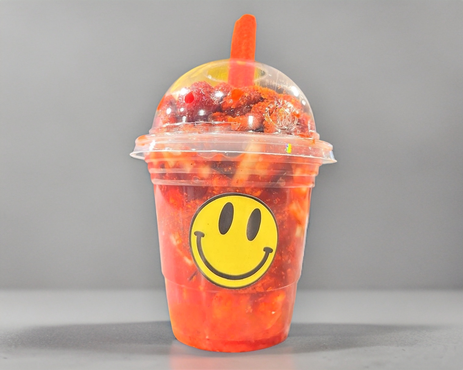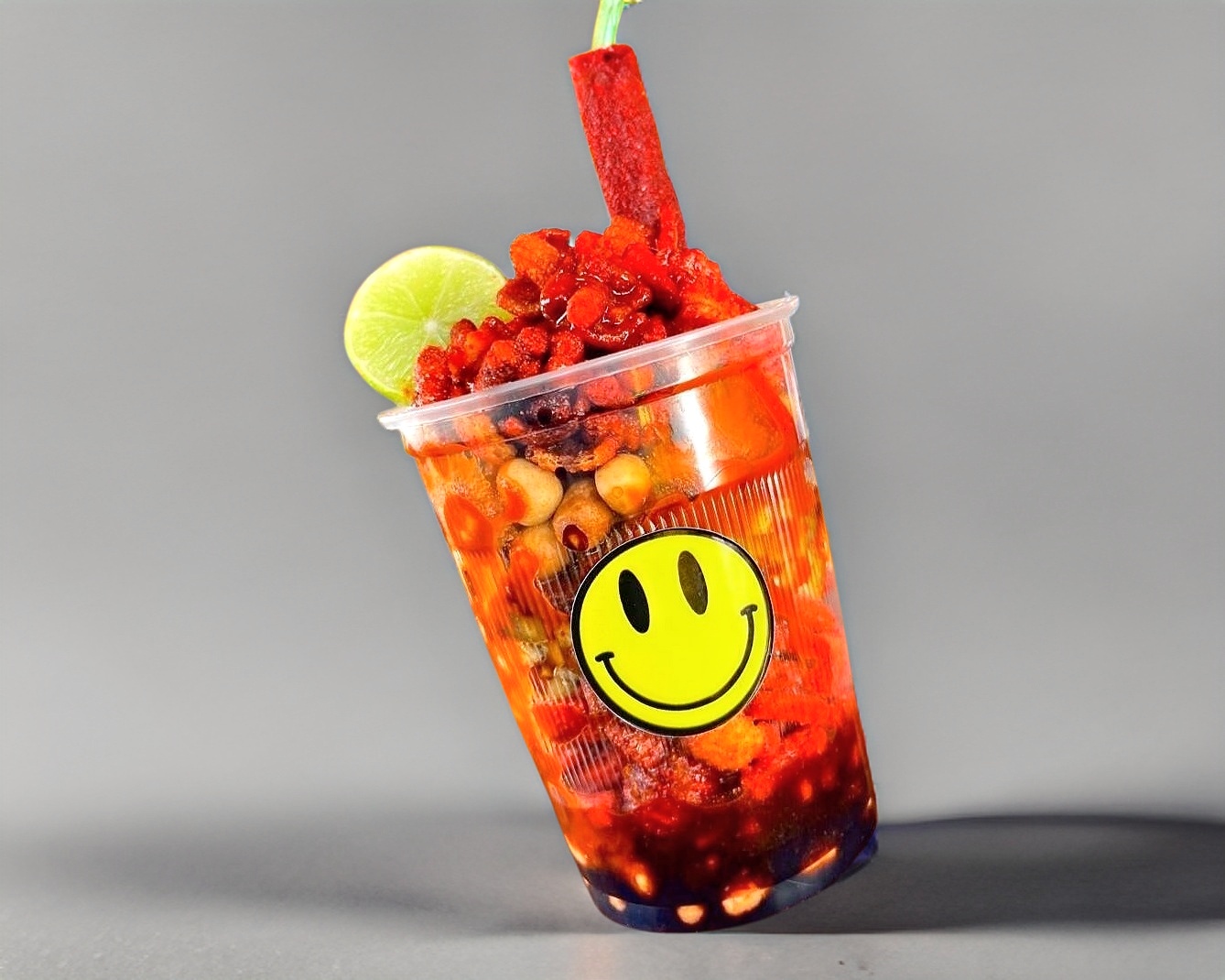 Deliciosos churros de maíz aciditos, mezclados con cacahuate, pepino, rieles de tamarindo, limón, bañados en clamato y con tus salsas favoritas empaquetadas, y lanceta de tamarindo.