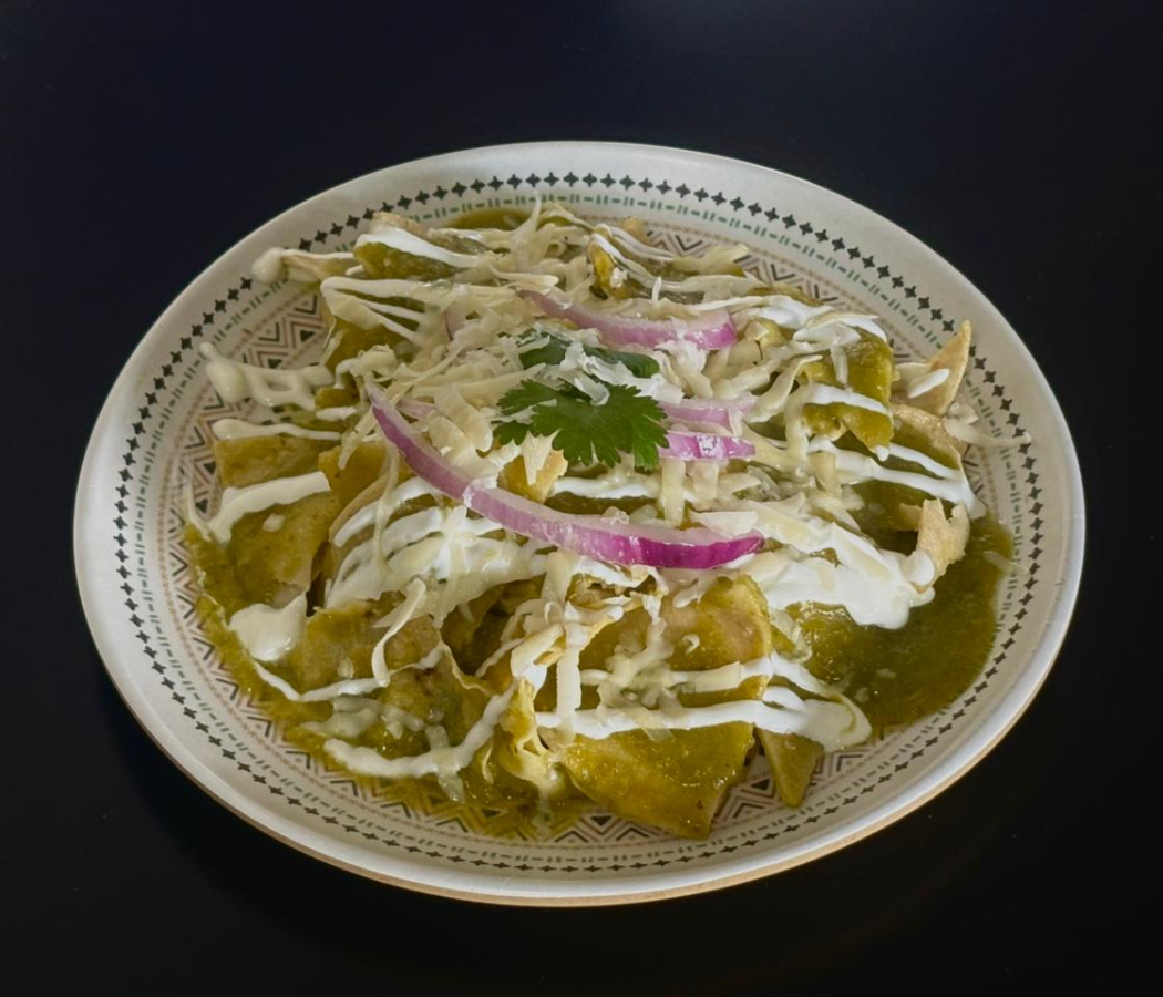 Chilaquiles en salsa verde, decorado con crema y cebolla