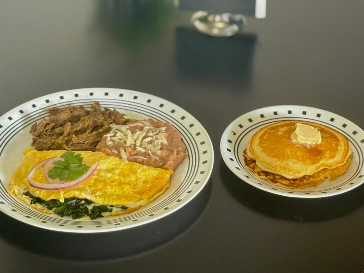 omelette de 2 huevos acompañados de frijoles, un guiso a elegir y ademas de 2 minihotcakes