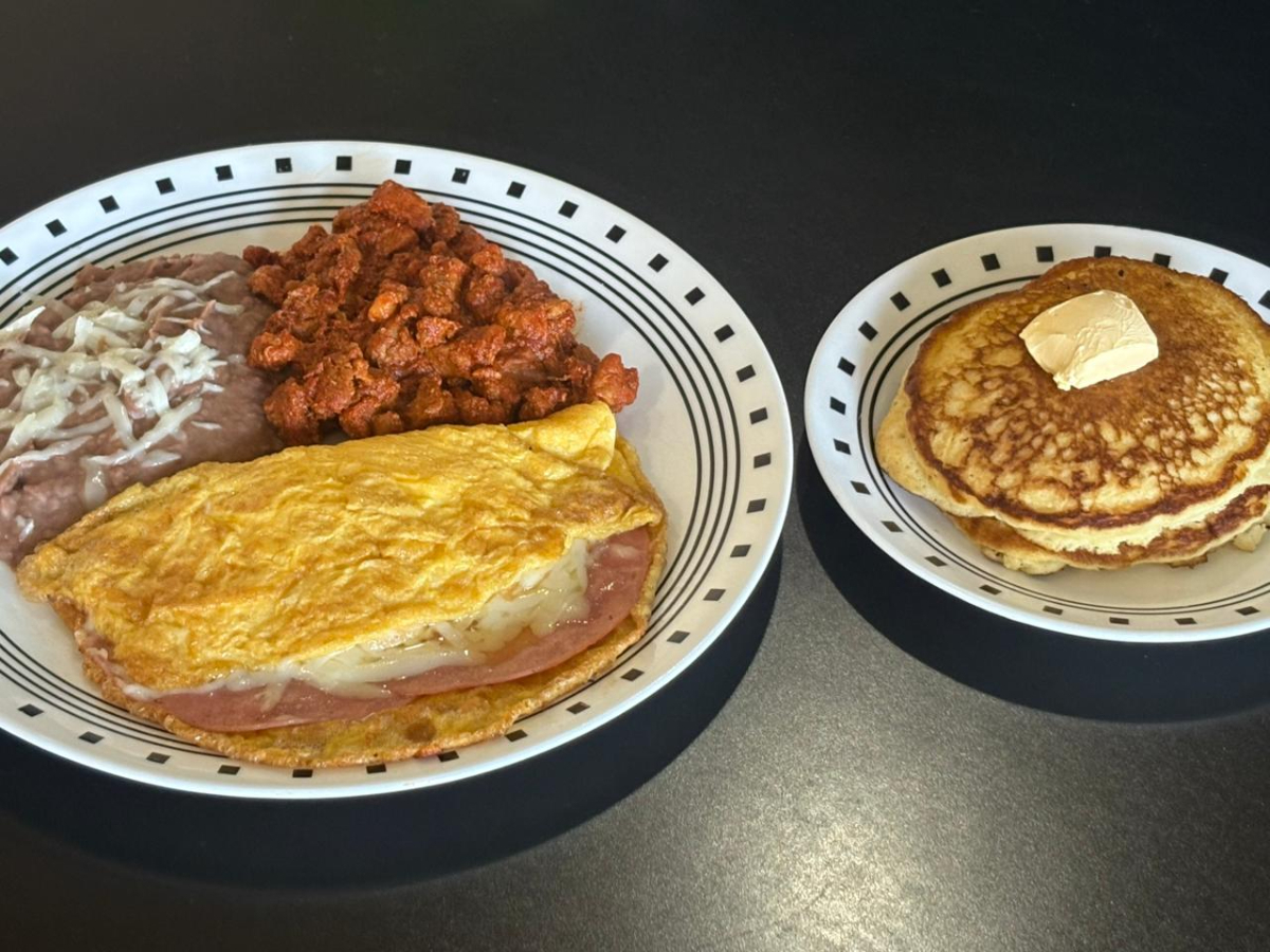 omelette de 2 huevos con jamon, frijoles y un guiso a elegir, además de 2 deliciosos mini hot cakes