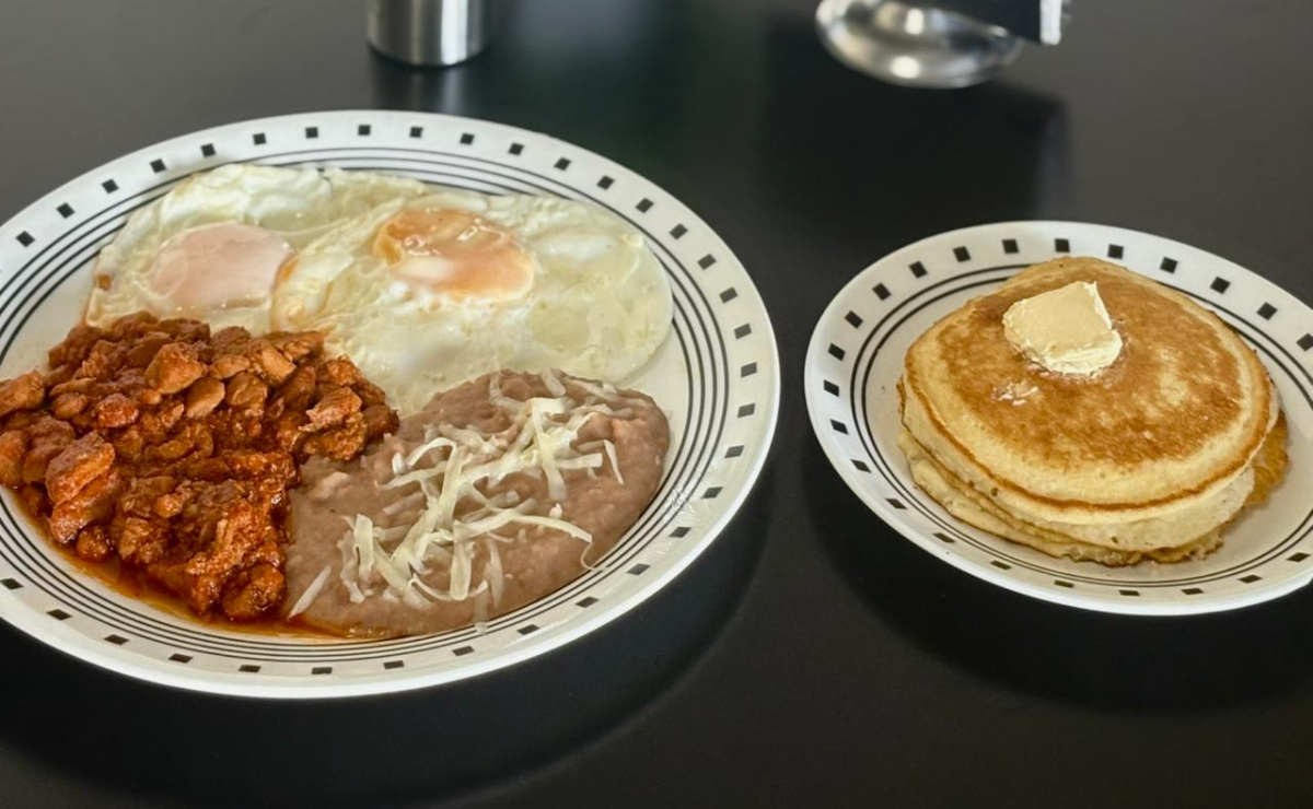 Dos huevos estrellados acompañados de frijoles y un guiso a elegir además de dos delicios mini hotcakes